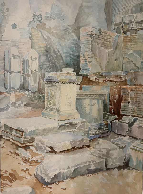 Raffiguranti: "Ruderi romani" (38 x 28 cm); "Fanciulla in costume tradizionale" (36 x 25 cm); "Marina" (23 x 34 cm), firmato in basso a destra. In cornice.