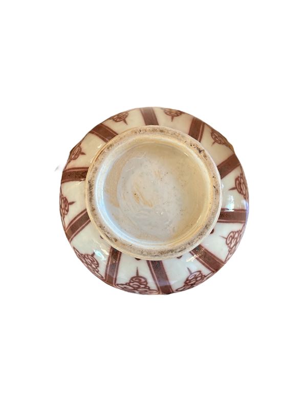 In porcellana decorata con fiori di loto e fasce stilizzate.