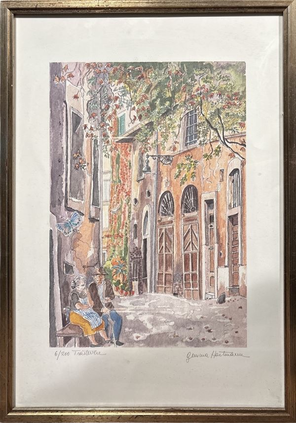 "Trastevere", es. 6/200, 49 x 34 cm, firma indistinta in basso a destra. In cornice.