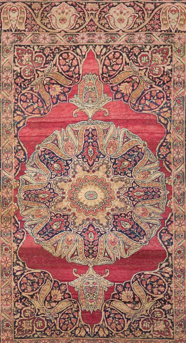 Disegno floreale con impianto a rosone centrale, esemplare di qualita’ fine sia nell’annodatura che nel dettaglio del disegno