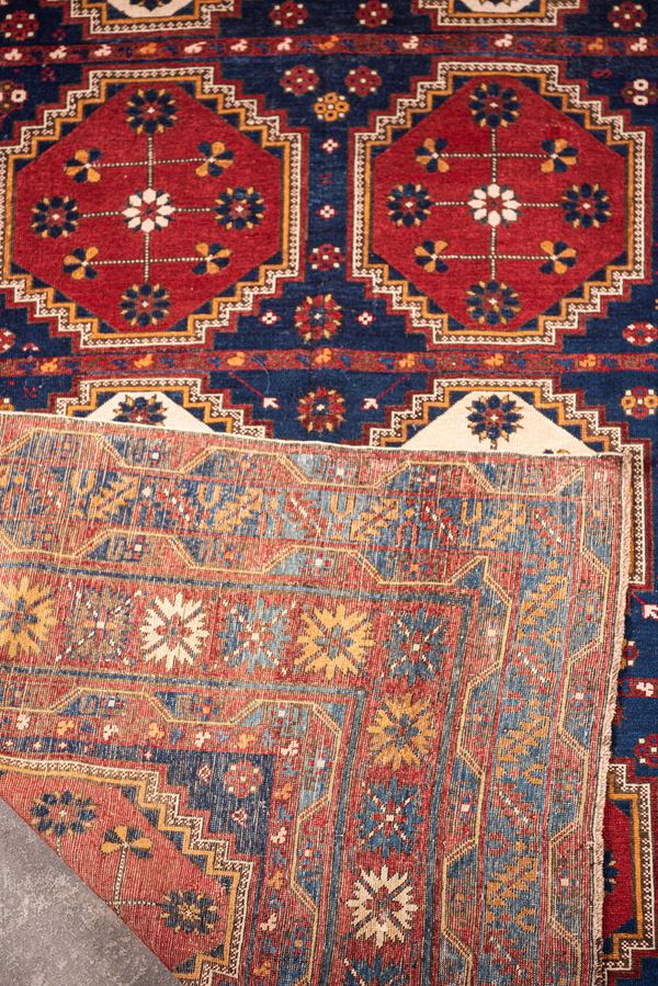 Fondo campo blu indaco dominato da imponenti esagoni scalettati, qualita’ di annodatura extra fine.