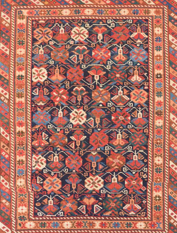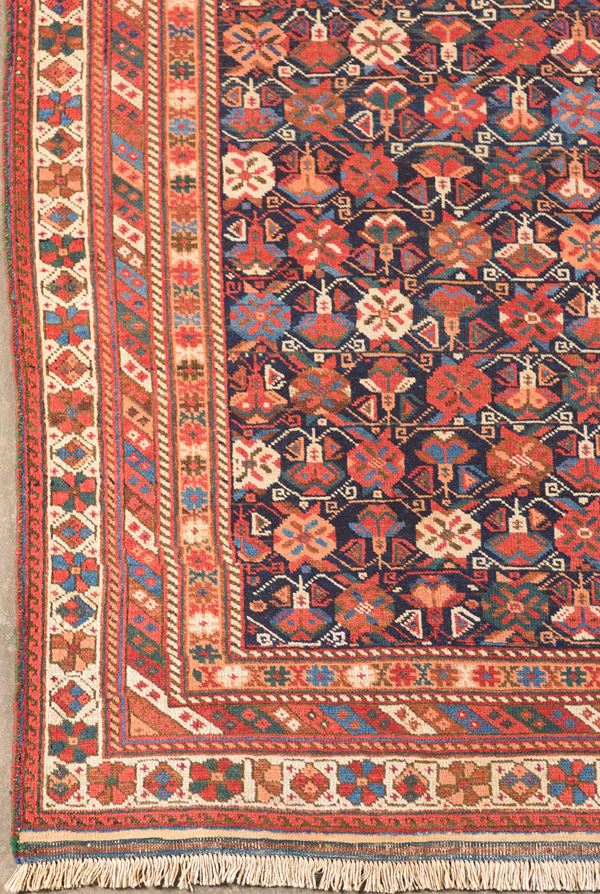 Appartenente al gruppo dei konagkend dell’ara di kuba. La struttura presenta una trama e ordito in lana e vello in lana tinta con colori vegetali.