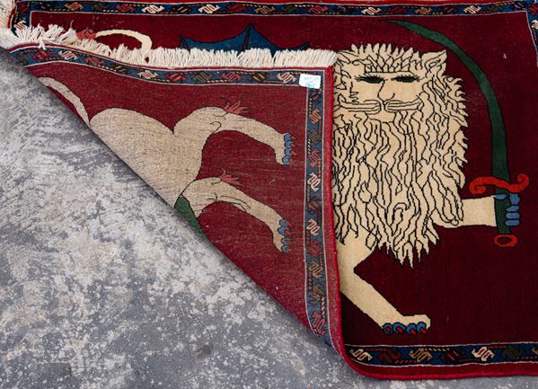 Tappeto persiano figurato, con disegno orizzontale raffigurante il leone con la spada e il sole, emblema tradizionale dello Shāh di Persia.