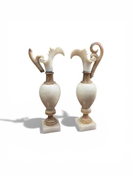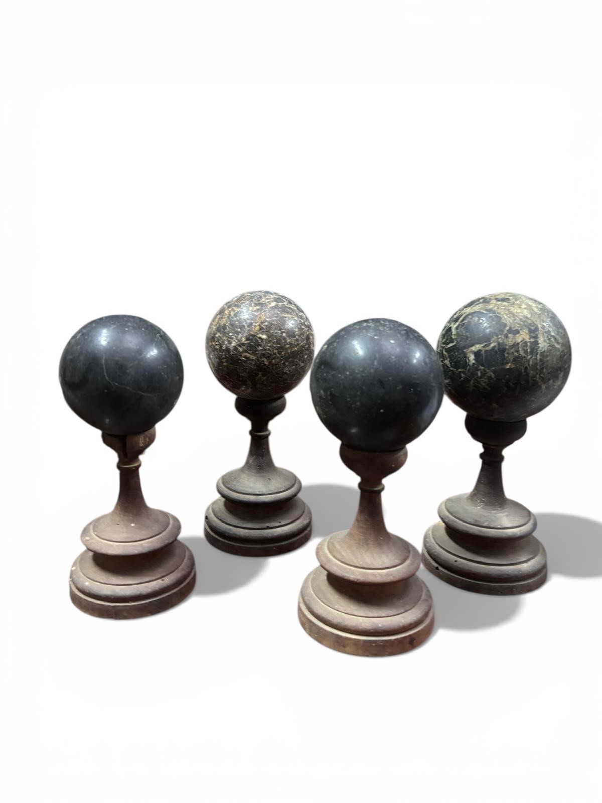 Quattro sfere in marmo e coppia di anfore in alabastro