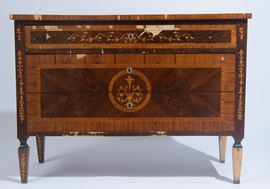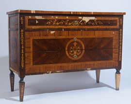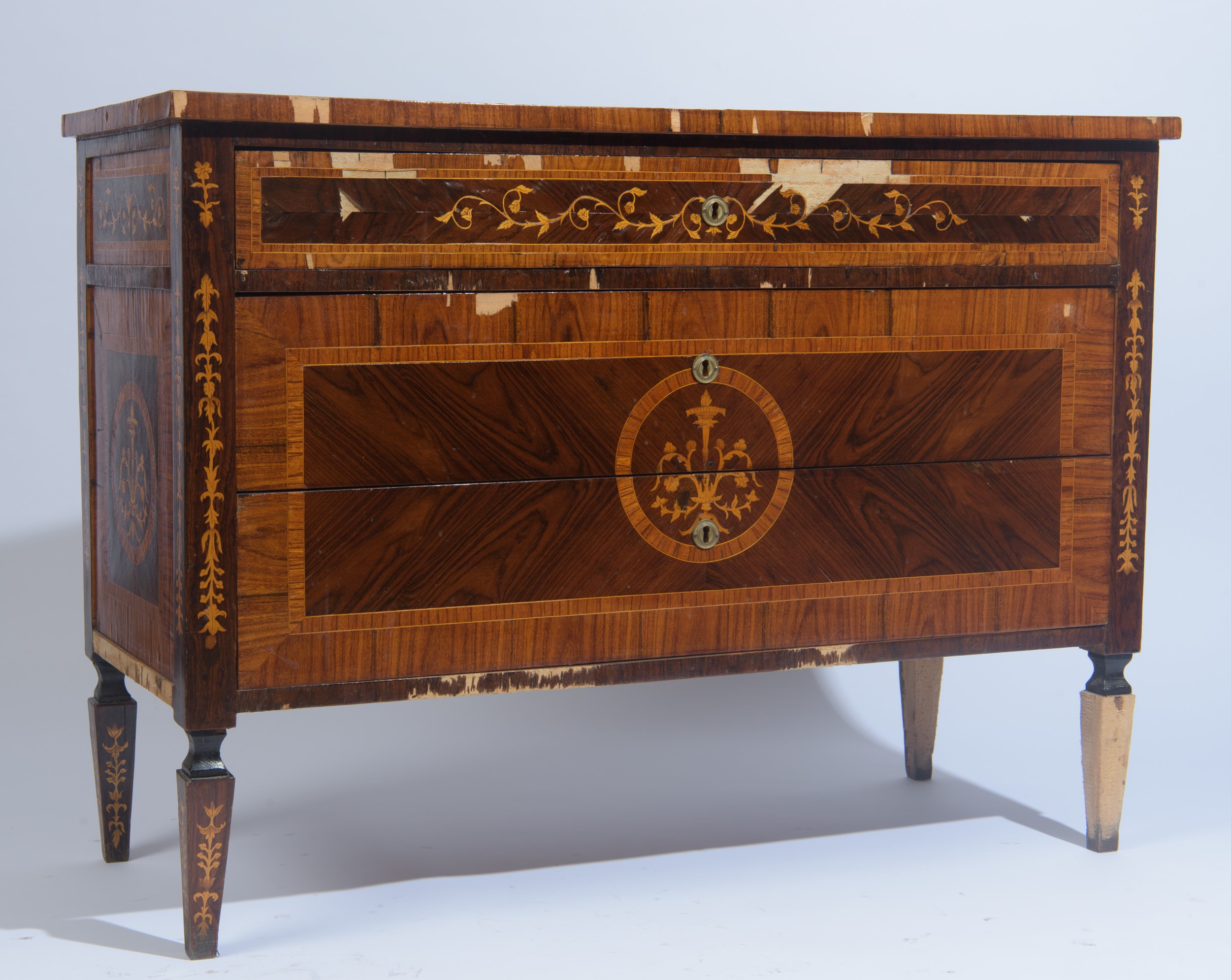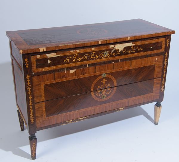 in legno di rosa, bosso e palissandro. Intarsi a motivi floreali. Importanti mancanze alla lastronatura.