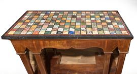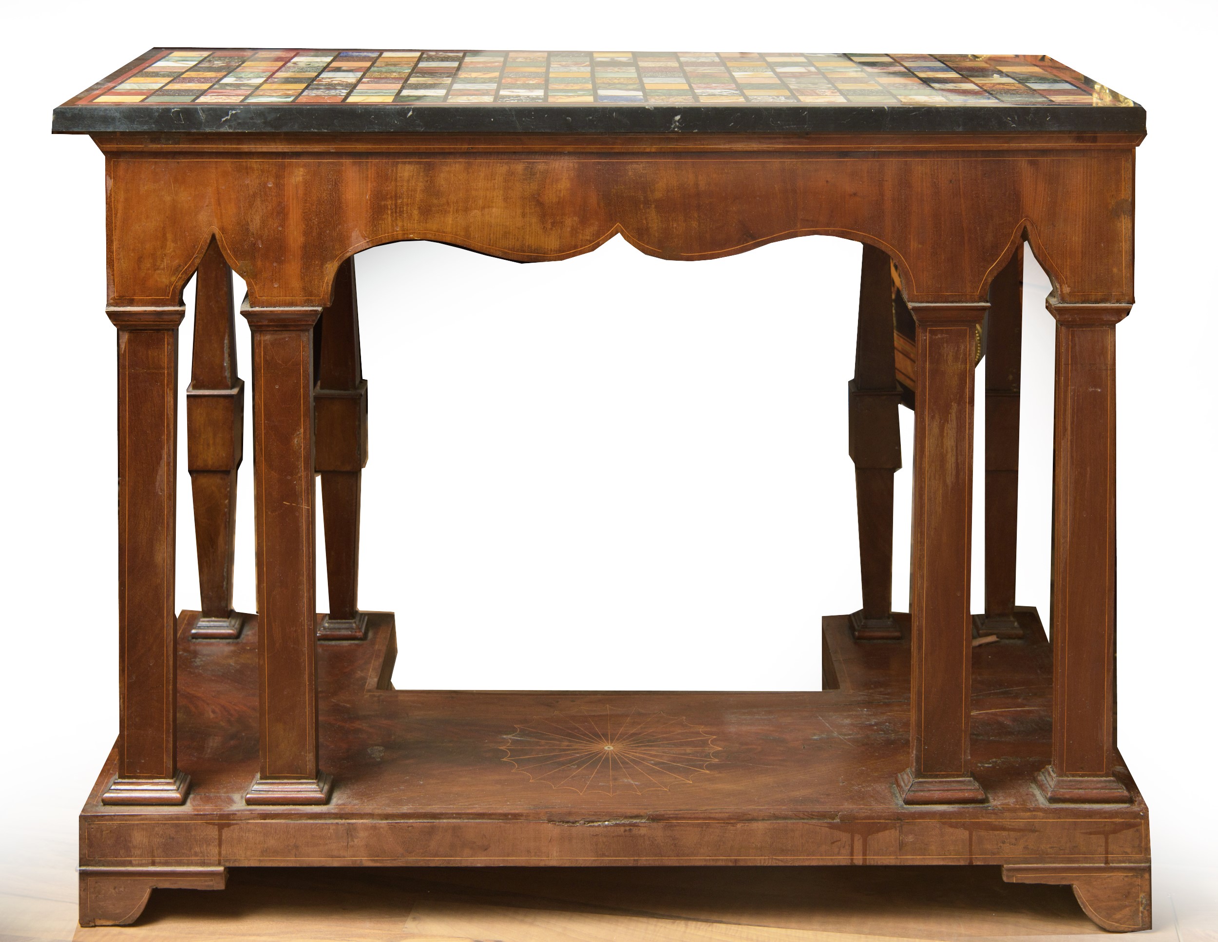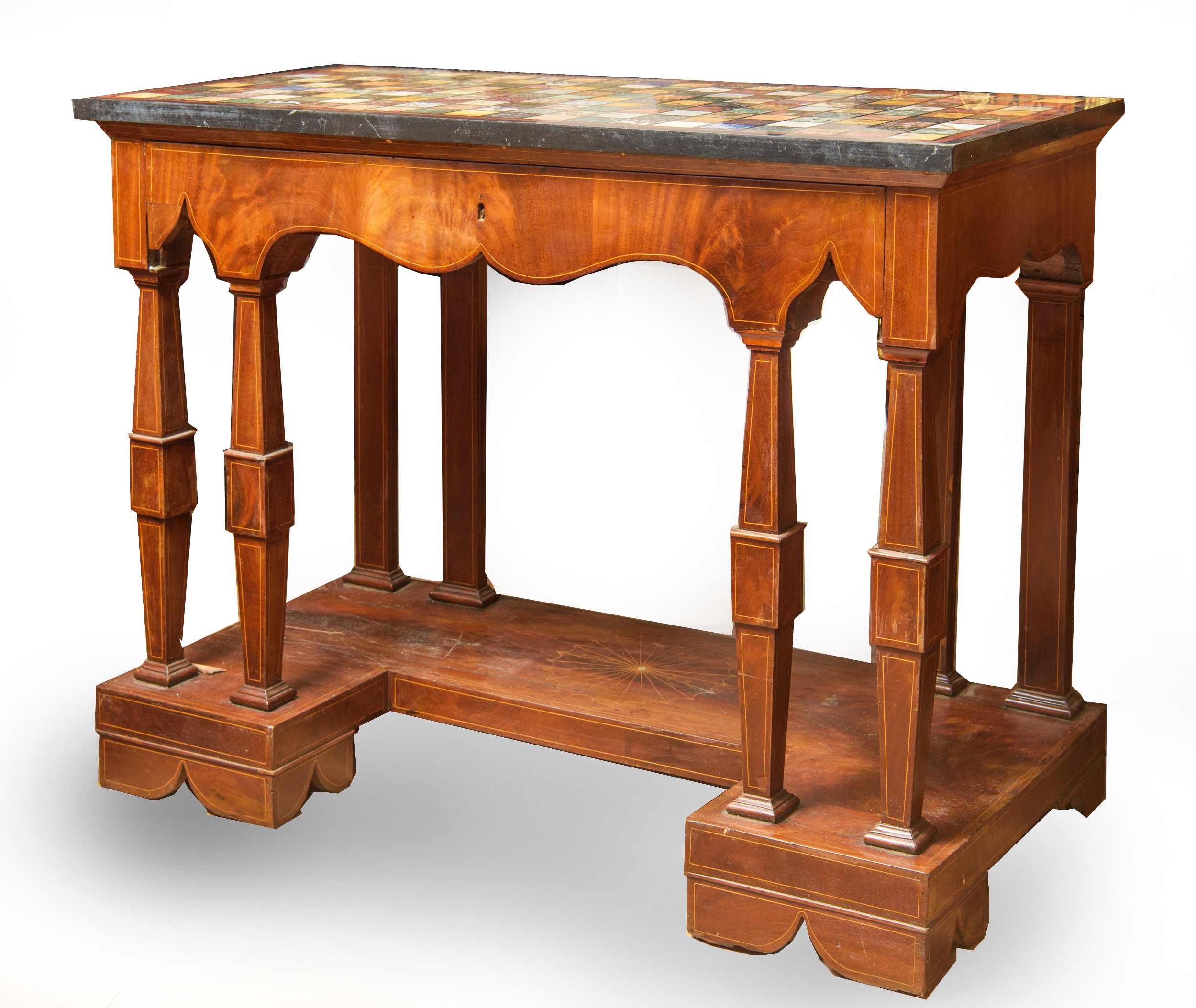 in legno di mogano con filettature in legno di bosso, otto piedi a baluastro poggianti su basamento, piano superiore in marmi e pietre dure varie a campionatura. Abrasioni e mancanze
