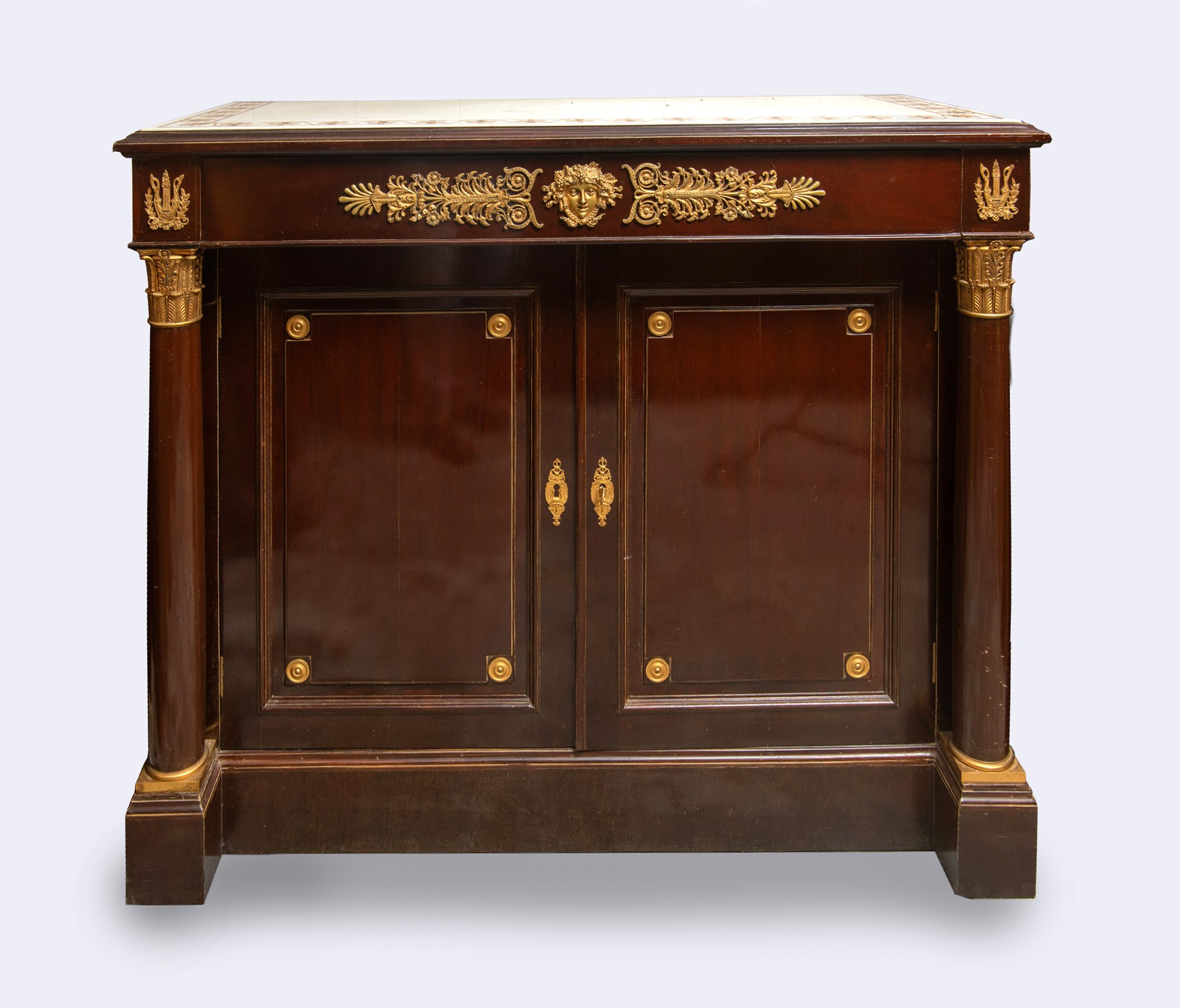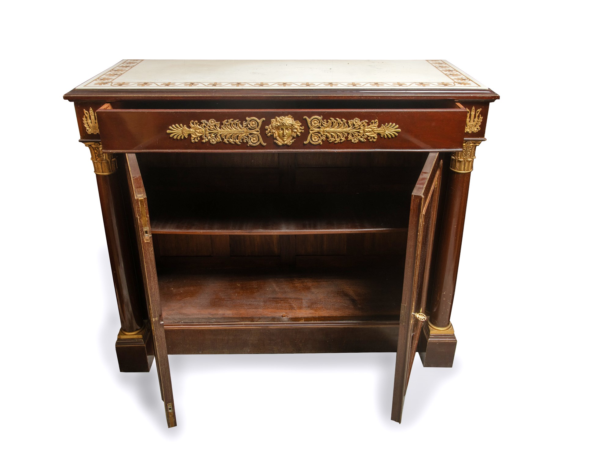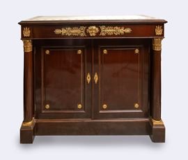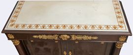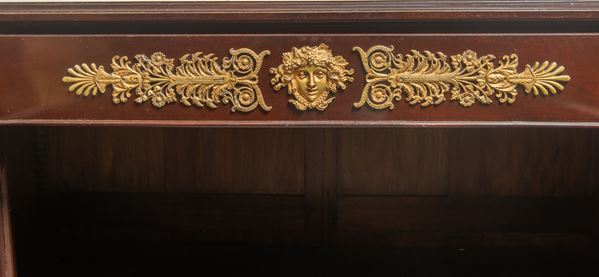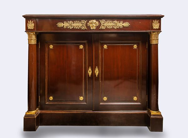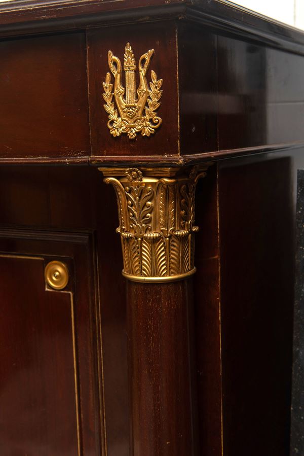a due ante, con cassetto superiore. Legno di mogano con decori in bronzo dorato, colonne con capitelli e piano superiore in marmo bianco statuario con intarsi a motivo di palmette in giallo antico.