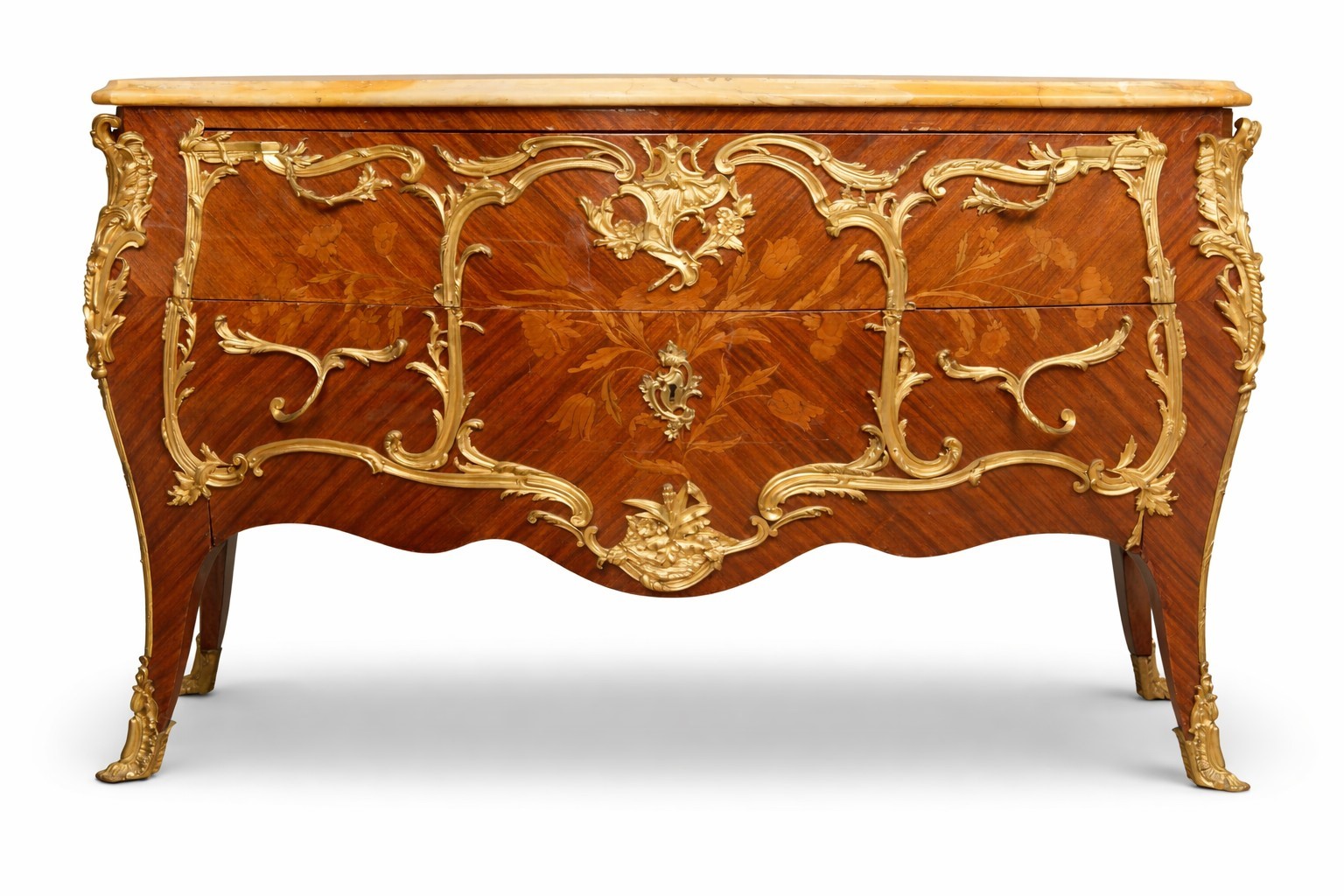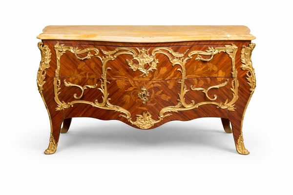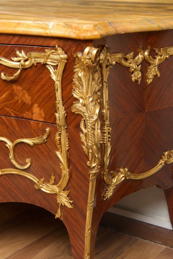 A due cassetti senza traversa. Con intarsi in legni vari di frutto a motivi floreali. Decori in bronzo finemente cesellati. Piano superiore in marmo giallo di Siena