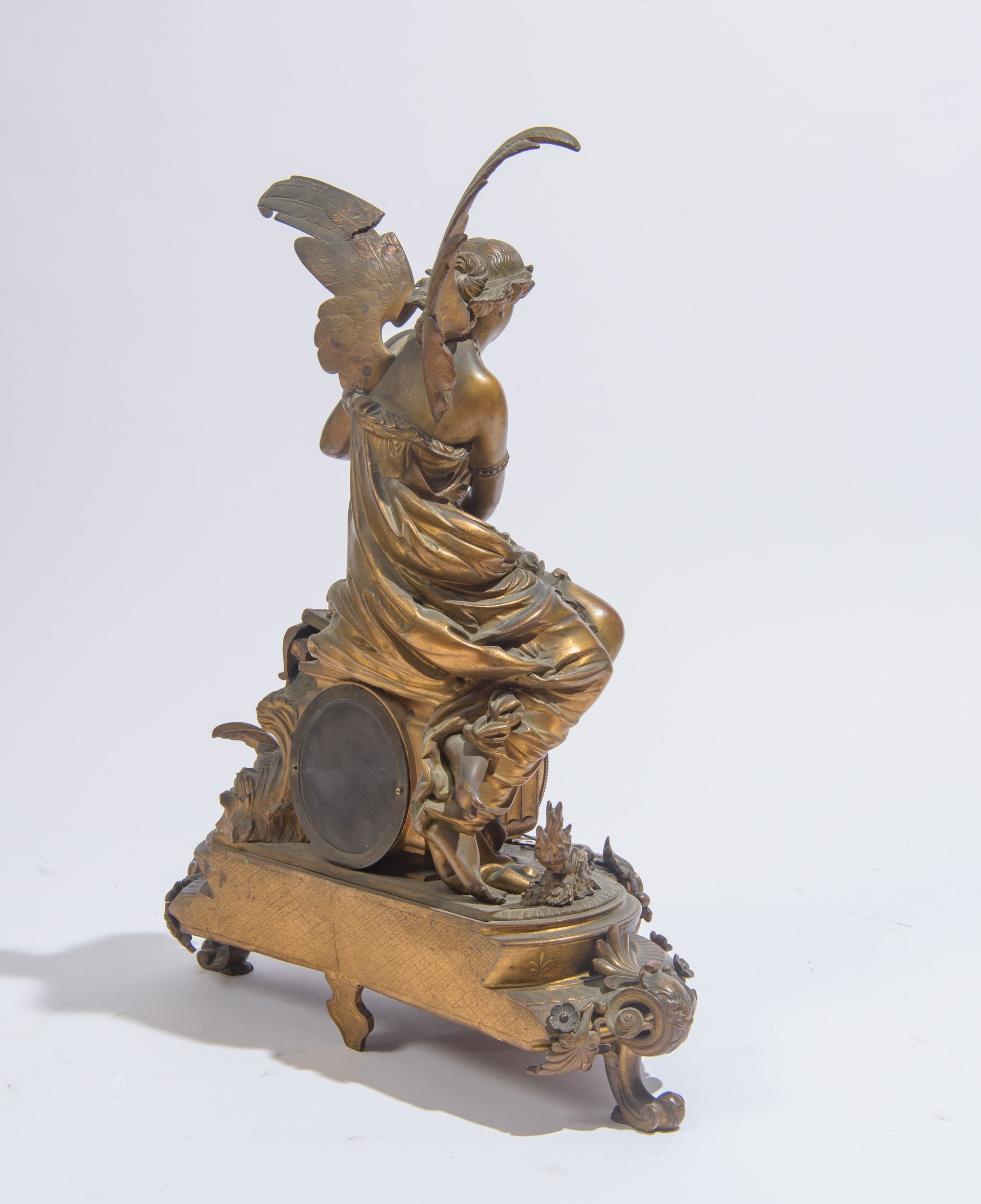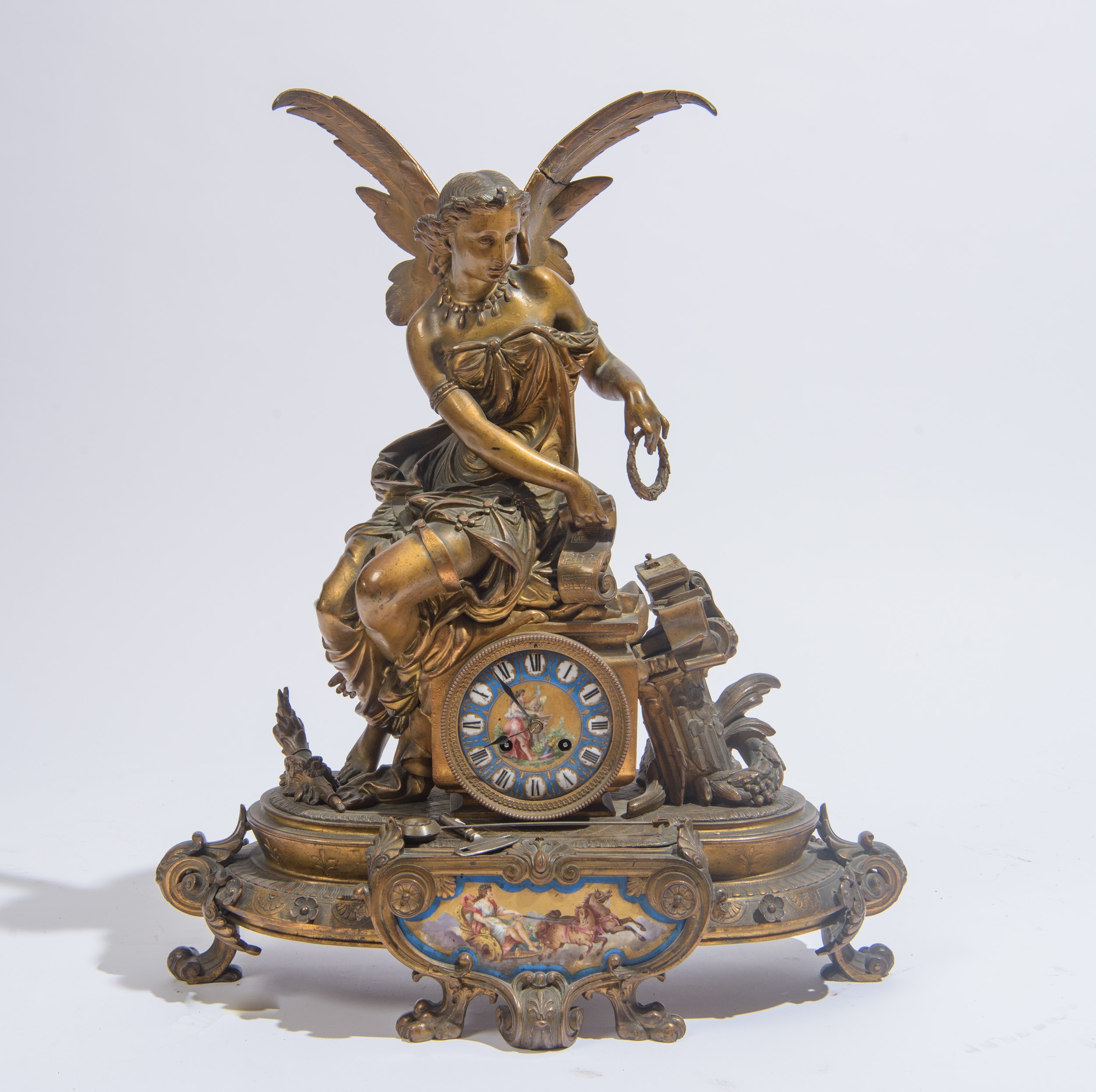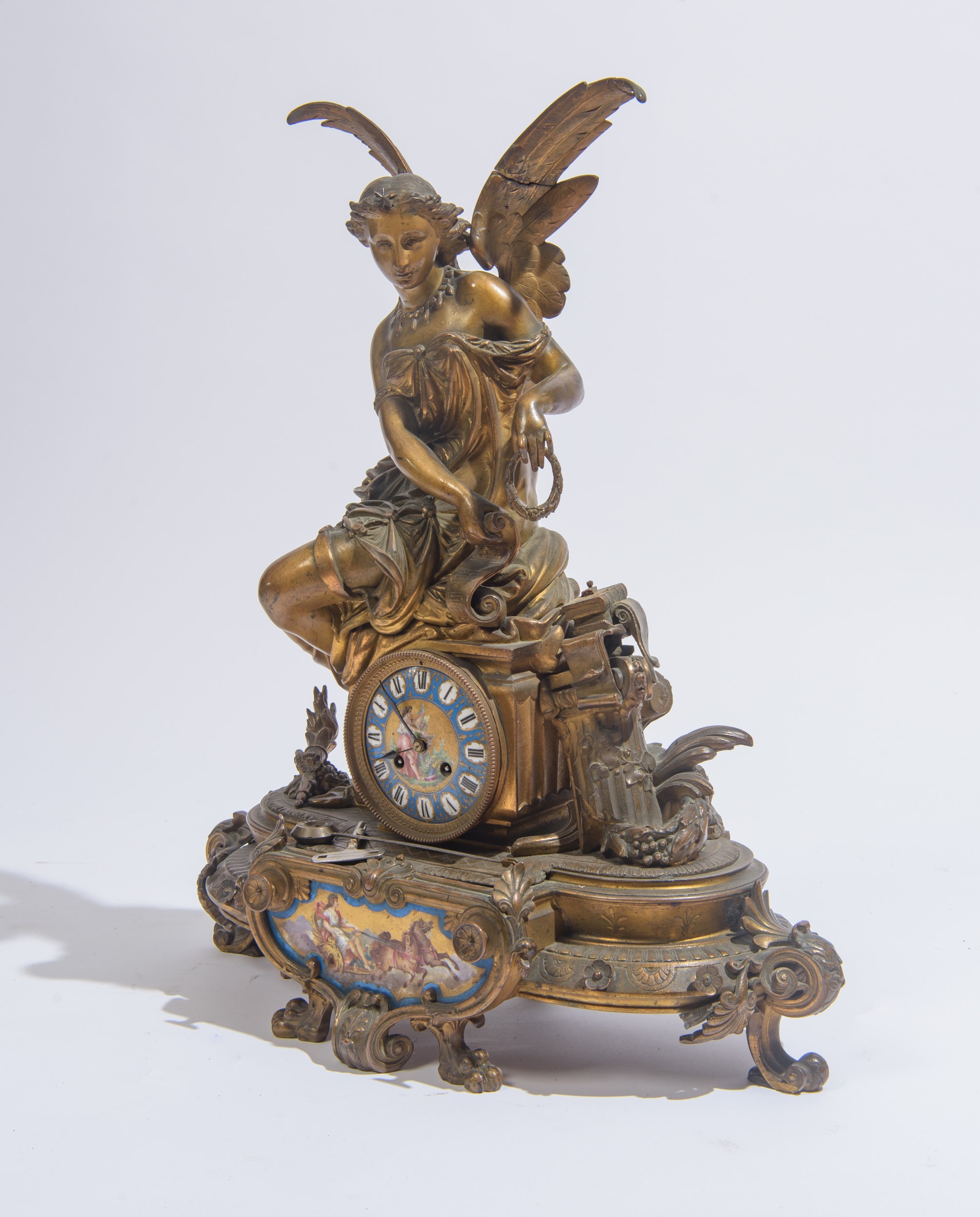 Sormontato da una scultura raffigurante una figura femminile alata. Quadrante a numeri romani e applicazioni in porcellana dipinta a scene mitologiche.