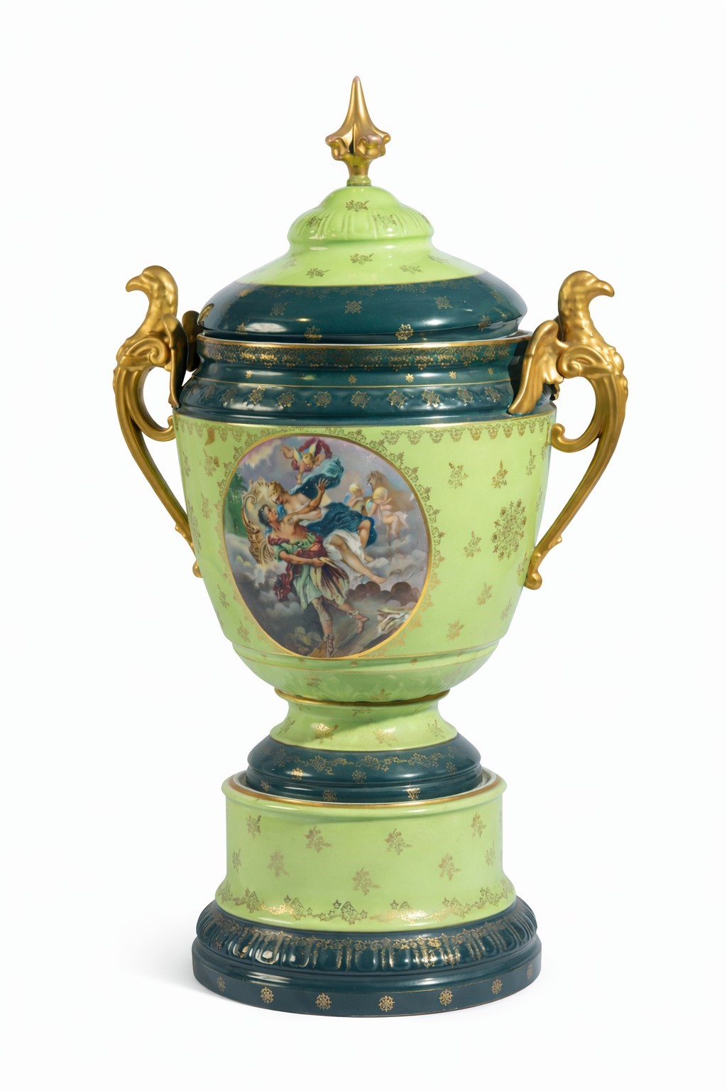 Con coperchio. Con decorazione sul fronte raffigurante scena mitologica. Restauri al pinnacolo superiore