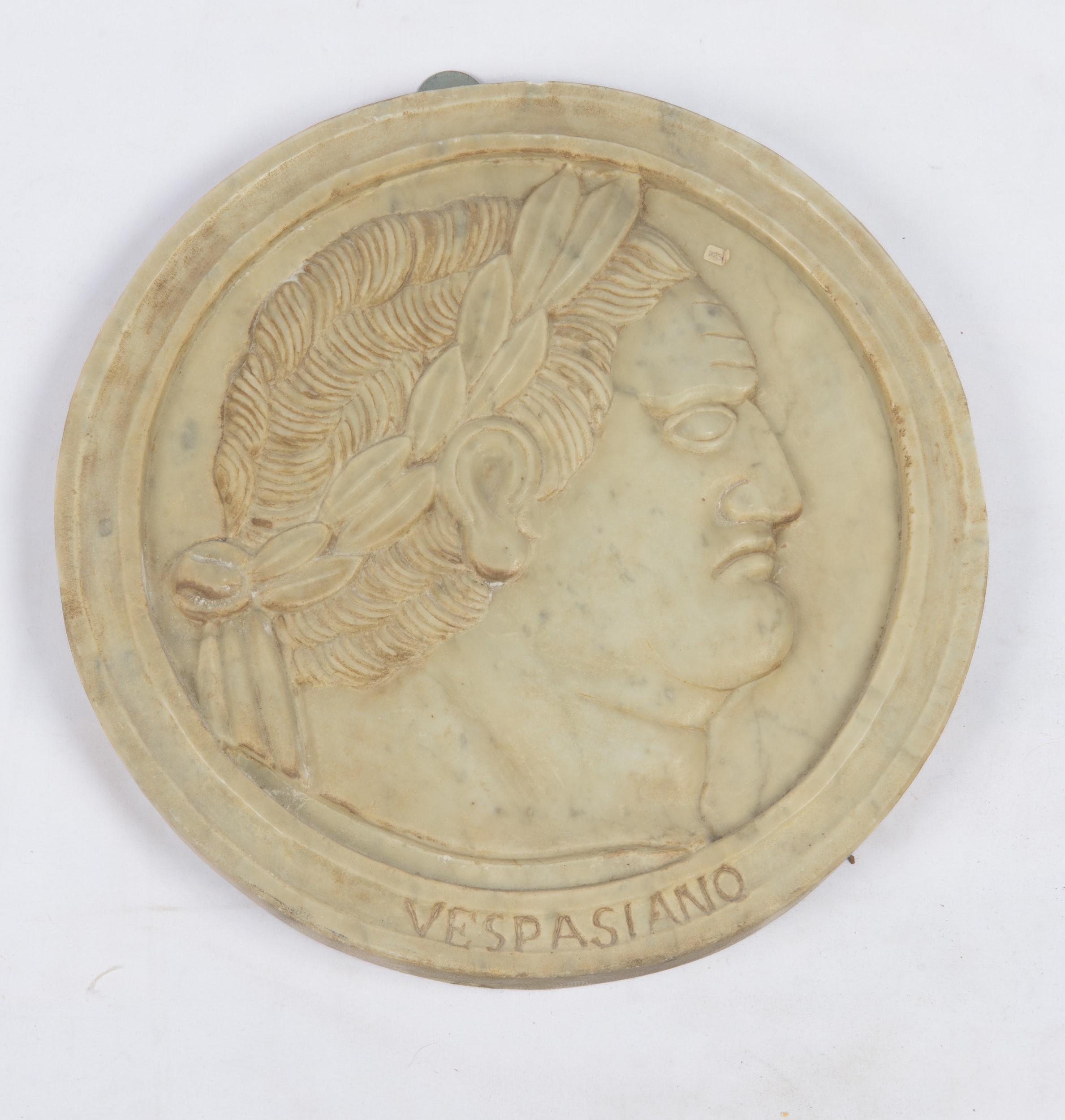 Di forma circolare. Scolpito a bassorilievo e raffigurante profilo di Vespasiano