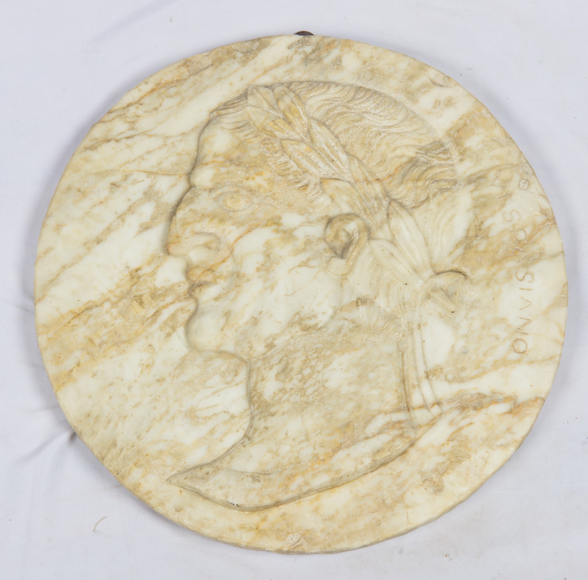 Di forma circolare. Scolpito a bassorilievo, raffigurante profilo di Vespasiano