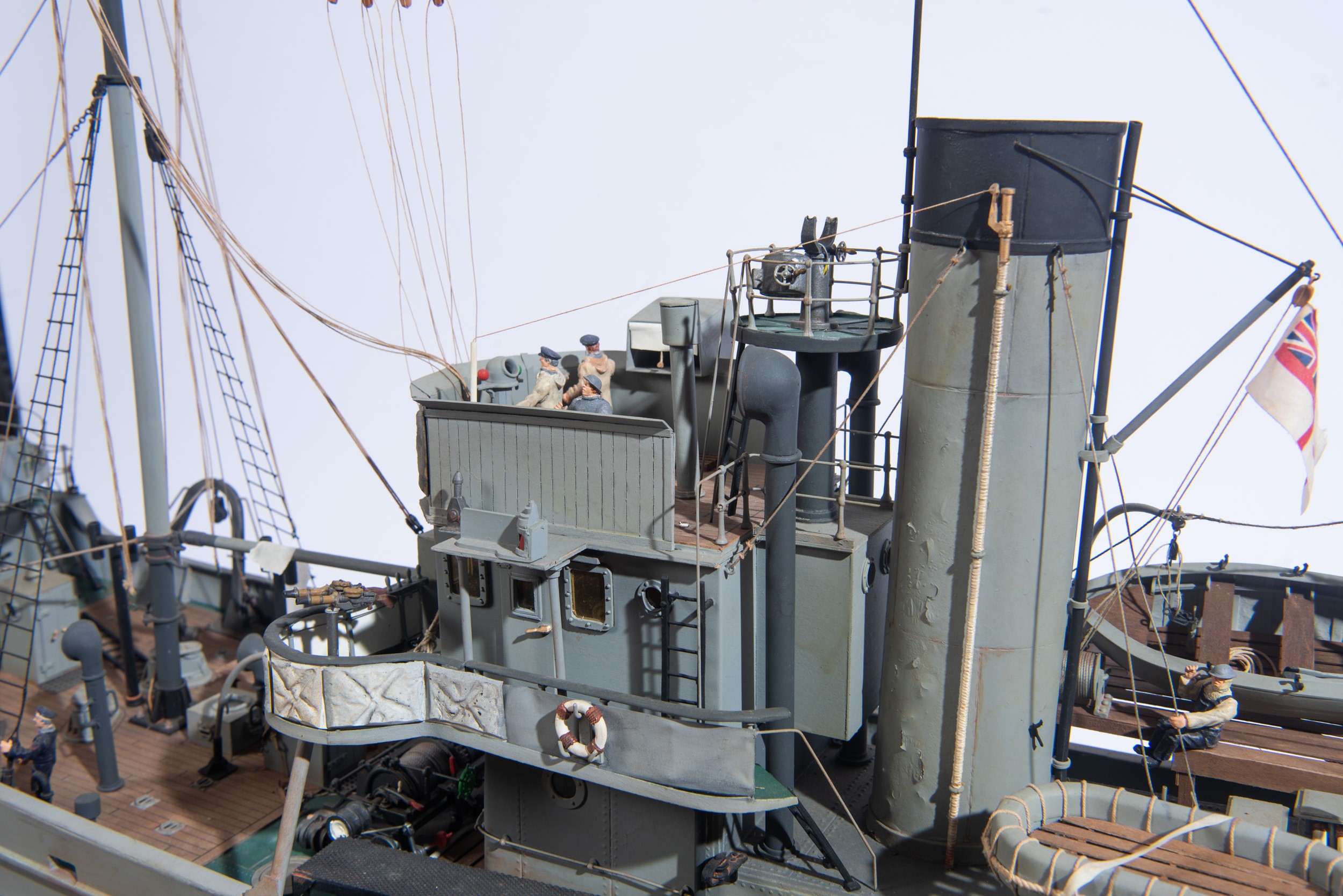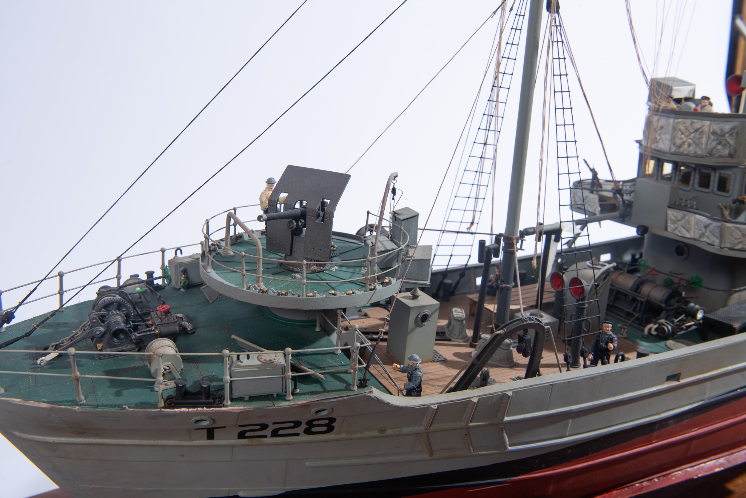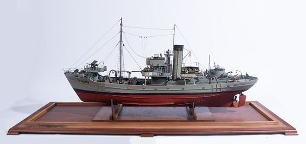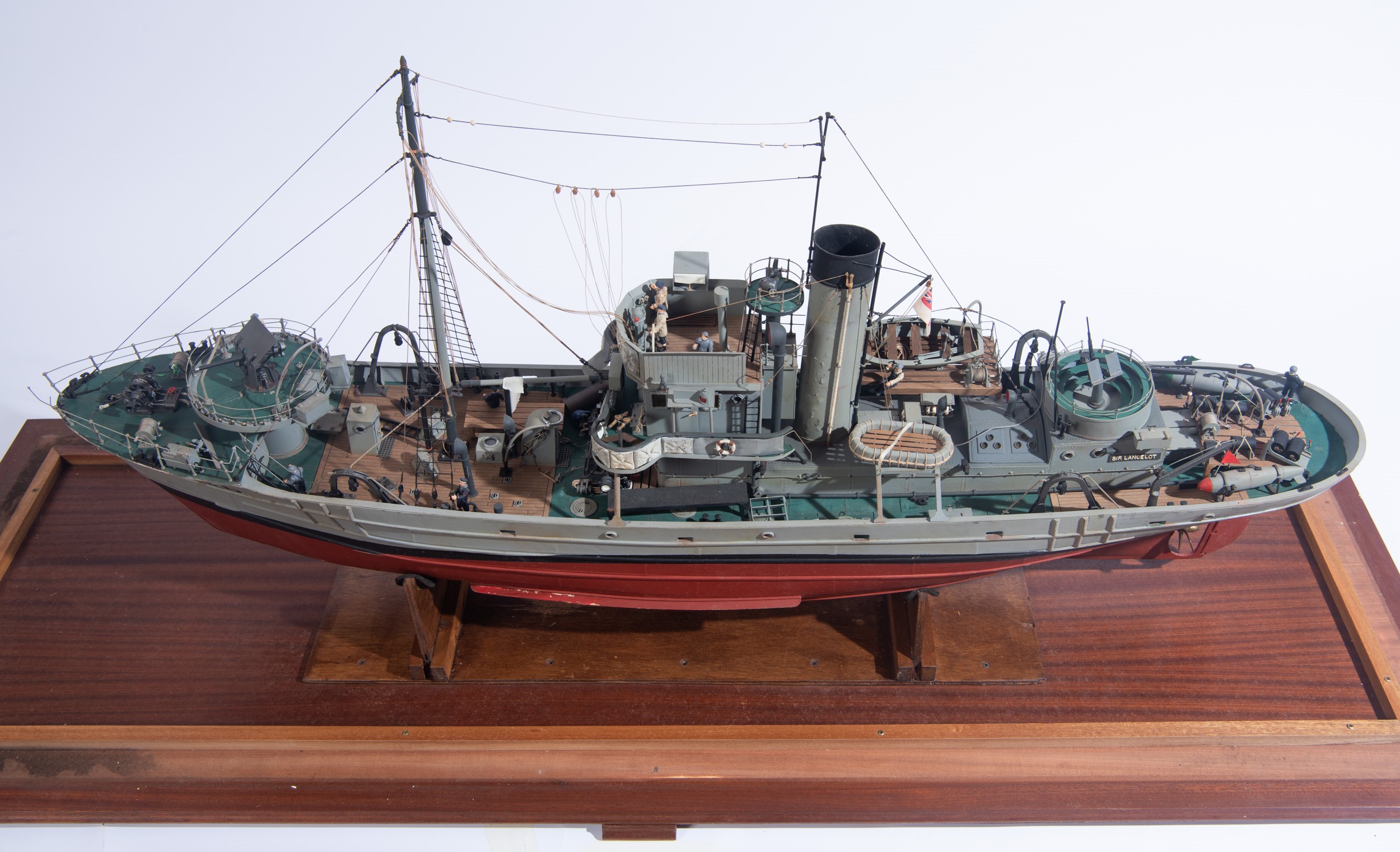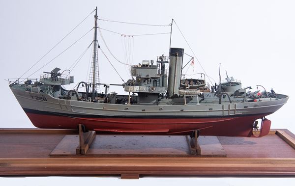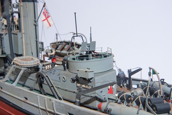 radiocomandato, di ottima costruzione e riccamente dettagliato, in legno e fibra di vetro, del dragamine-trawler classe Round Table H.M.S. Sir Lancelot, numero di identificazione T228 (1941), realizzato da Brian Clark, con scafo preformato su misura, ponti in legno listellato completi di accessori, armamento e sovrastruttura removibile, dotato di motore elettrico e servi.
