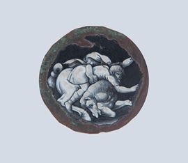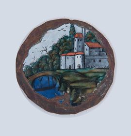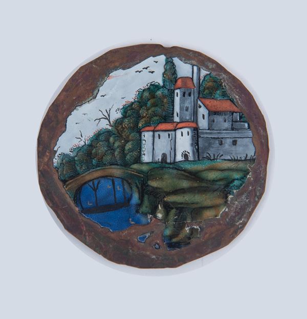 Raffigurante al verso: Scena di battaglia; al retro: Veduta di castello.