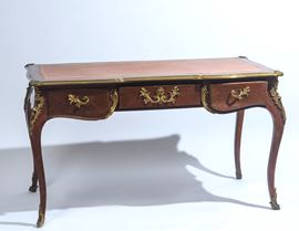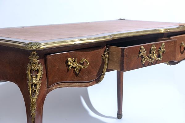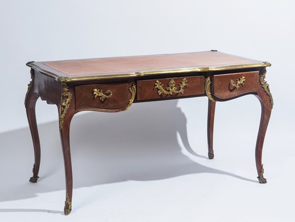 a tre cassetti, in legno di ebano rosa. Piano in pelle, applicazioni in bronzo dorato. Di linea luigi XV