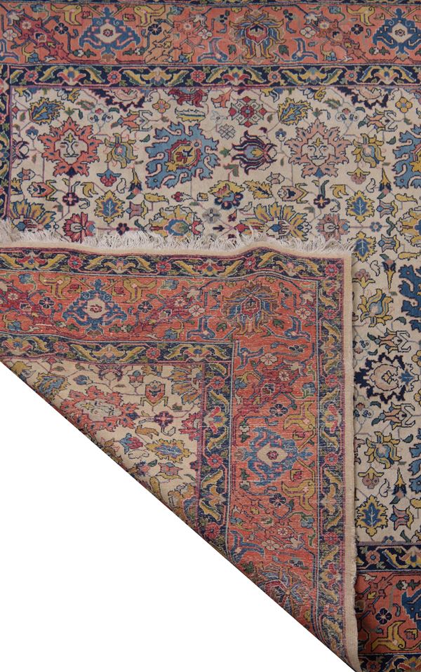 con decorazioni tipiche del motivo Herati, fondo chiaro avorio/beige e cornice a fondo arancio