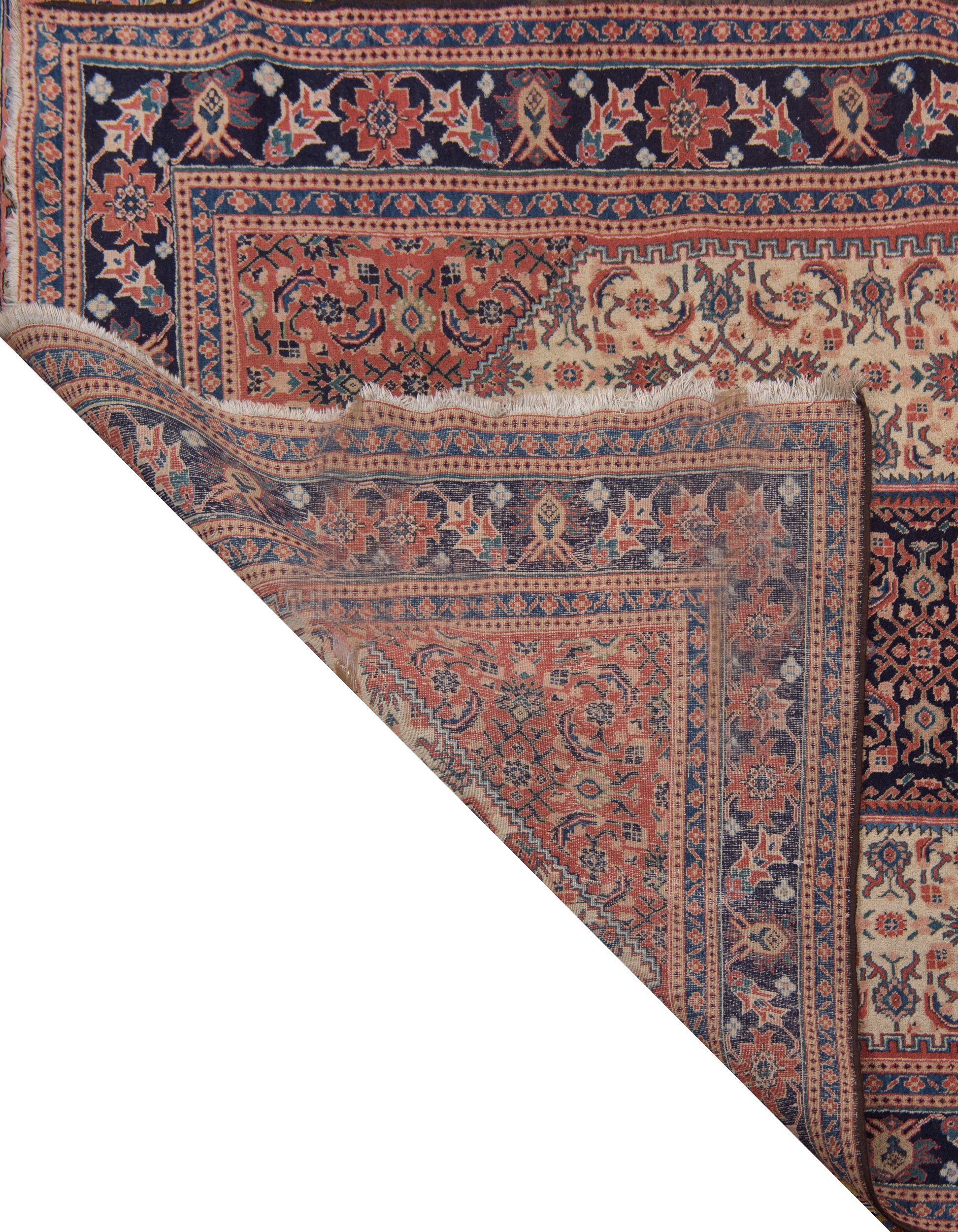 motivo geometrico con medaglione centrale esagonale su campo avorio/beige. Rosso intenso, blu scuro/navy e avorio/crema