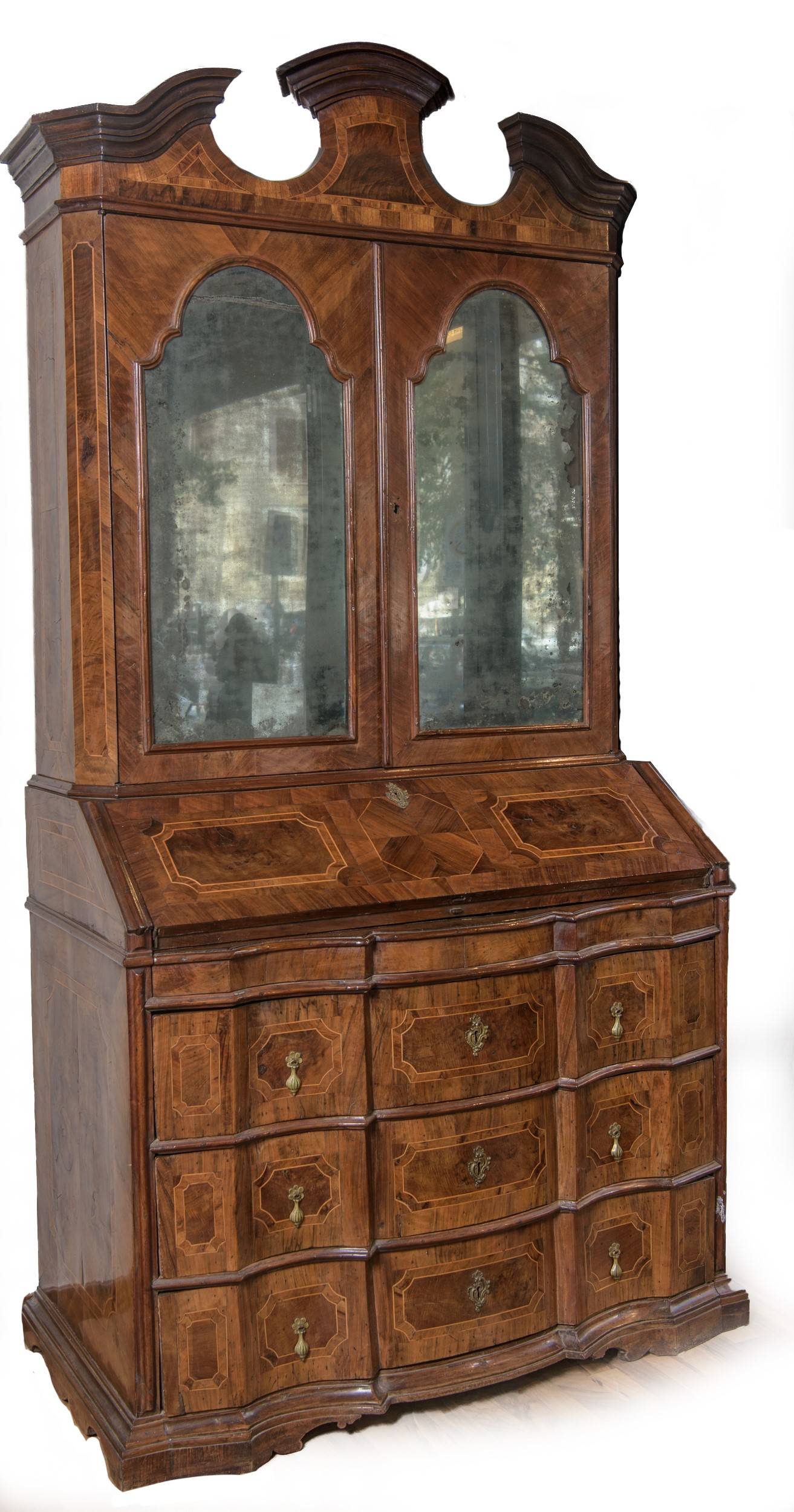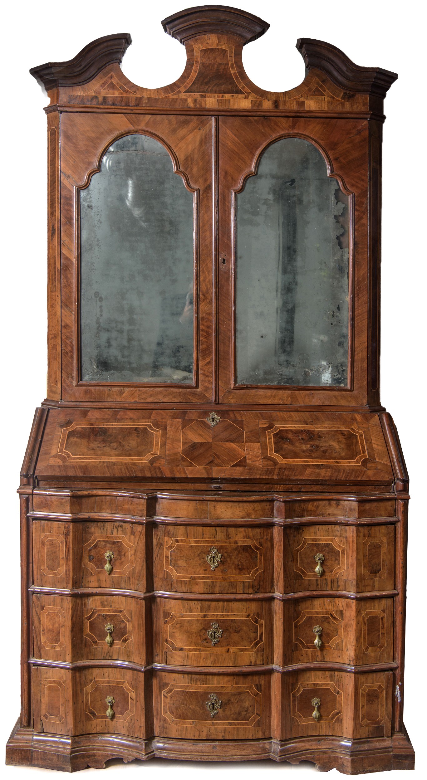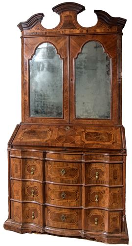 A due corpi. Filettatura in bosso. Fronte centinato a tre cassetti. Calatoia con cassettiera interna. Due ante superiori con parte interna foderata con specchi non pertinenti