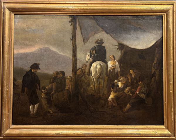 L'opera è una parziale ripresa dell'opera di Wouwerman, conservata presso il National Museum di Ottawa. Entro cornice in legno dorato del XX secolo.
