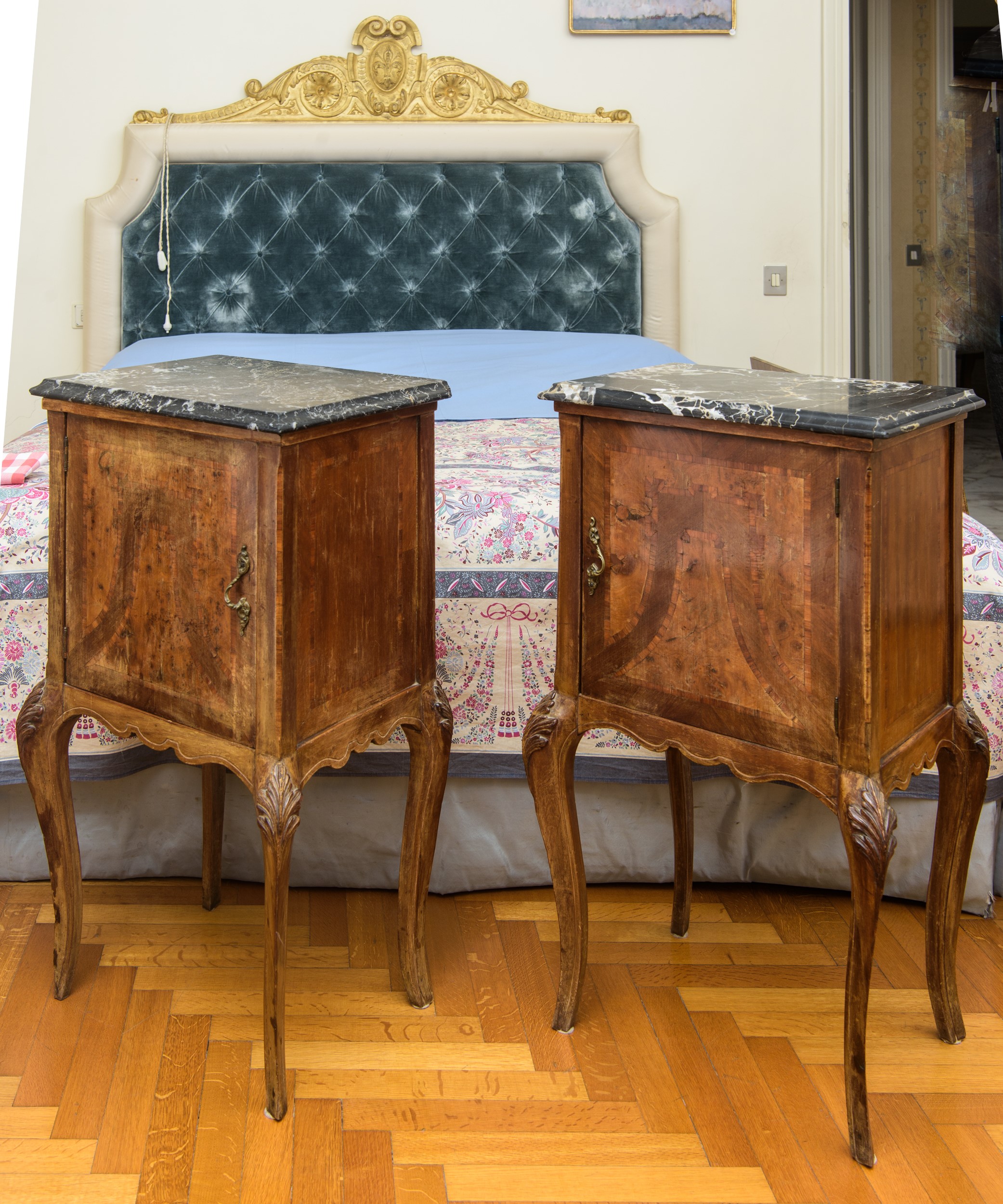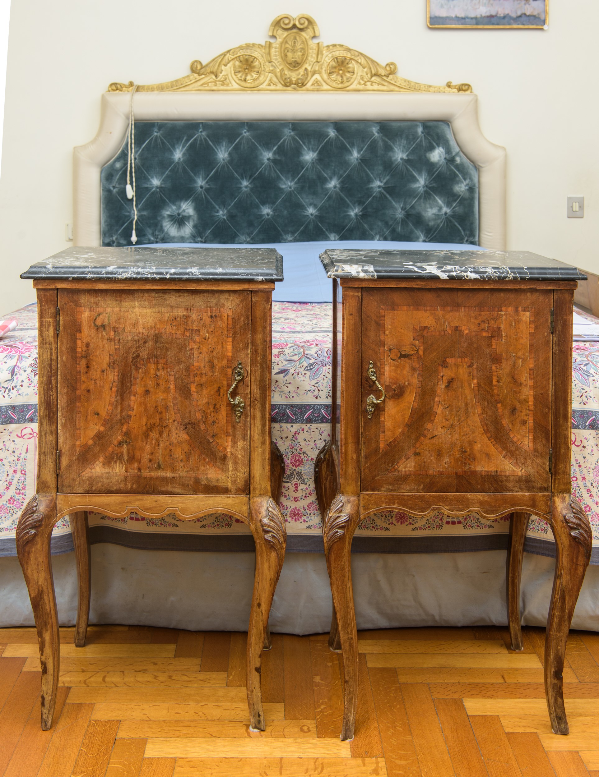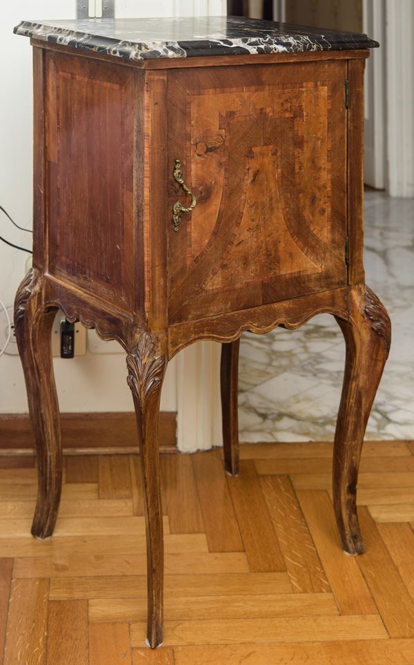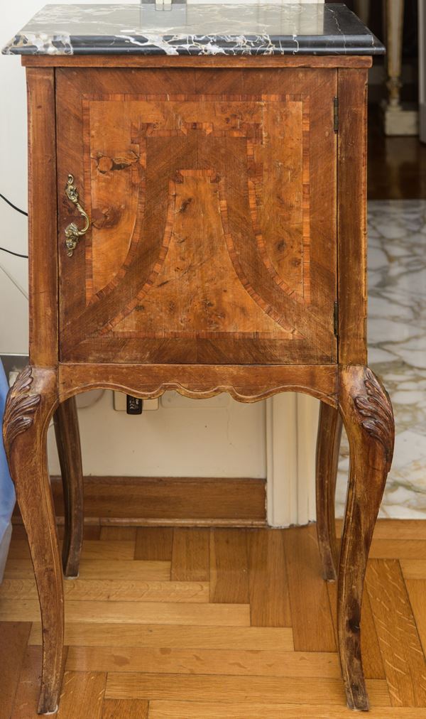 Realizzati in legno massello con impiallacciatura in radica. Presentano struttura mossa con gambe cabriole slanciate e grembiule sagomato. Il fronte è caratterizzato da anta singola incernierata con pannello impiallacciato a disegno geometrico, mentre il piano è in marmo sagomato.