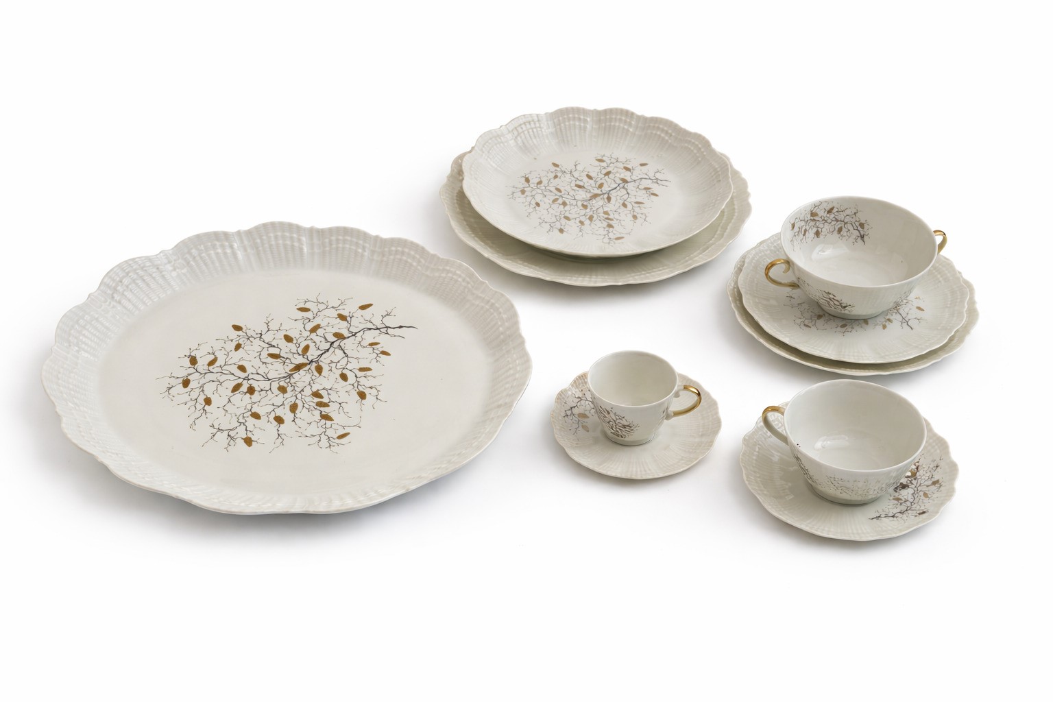 decorata a gelso. Composto da : 19 piatti piani, 10 piatti fondi, 6 tazze consommé e 9 sottopiattini, 8 tazze da thè, e 8 sotto sottopiattini, 14 piattini da dolce, 16 piattini da frutta e 1 piatto da portata ovale.