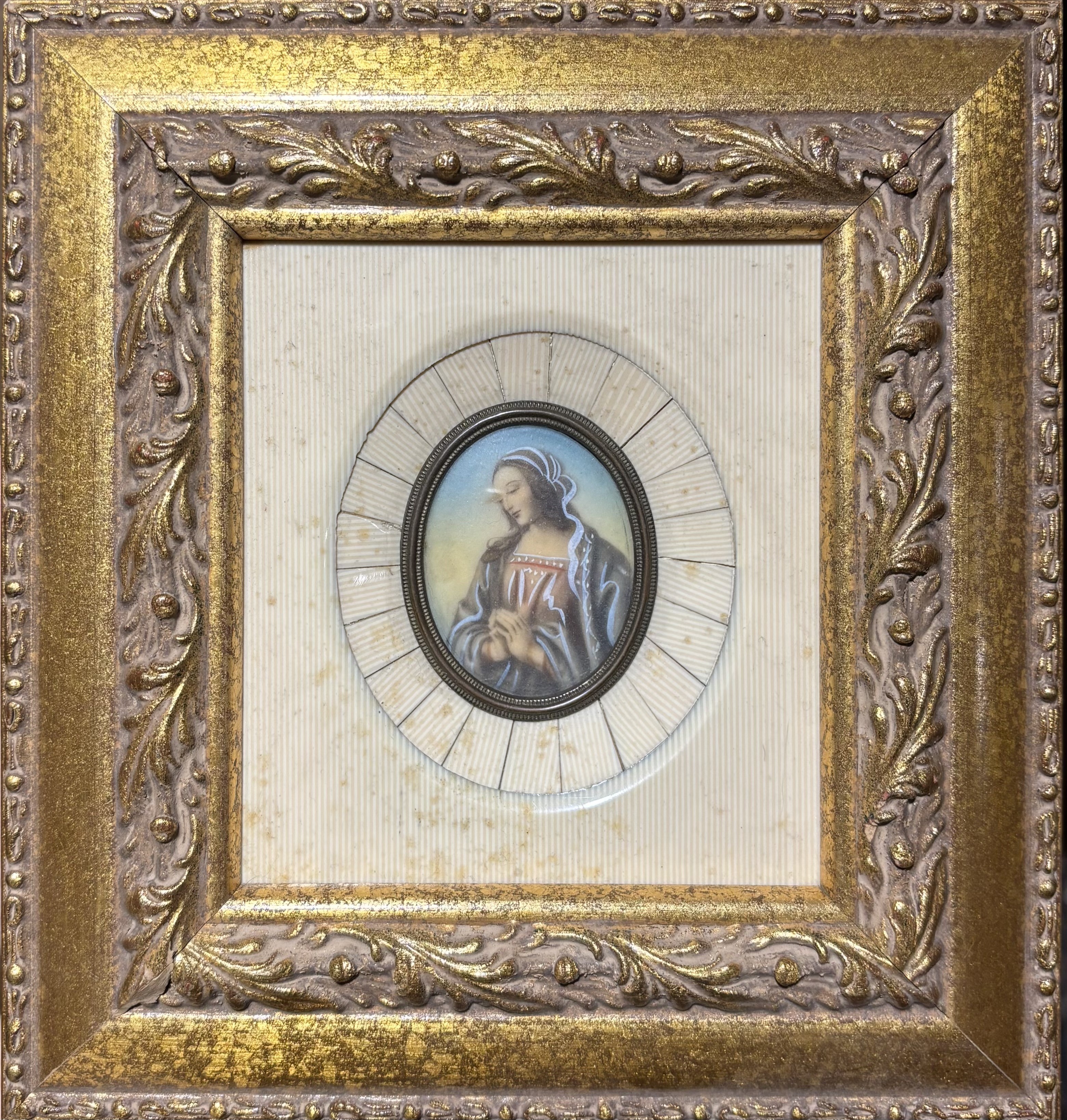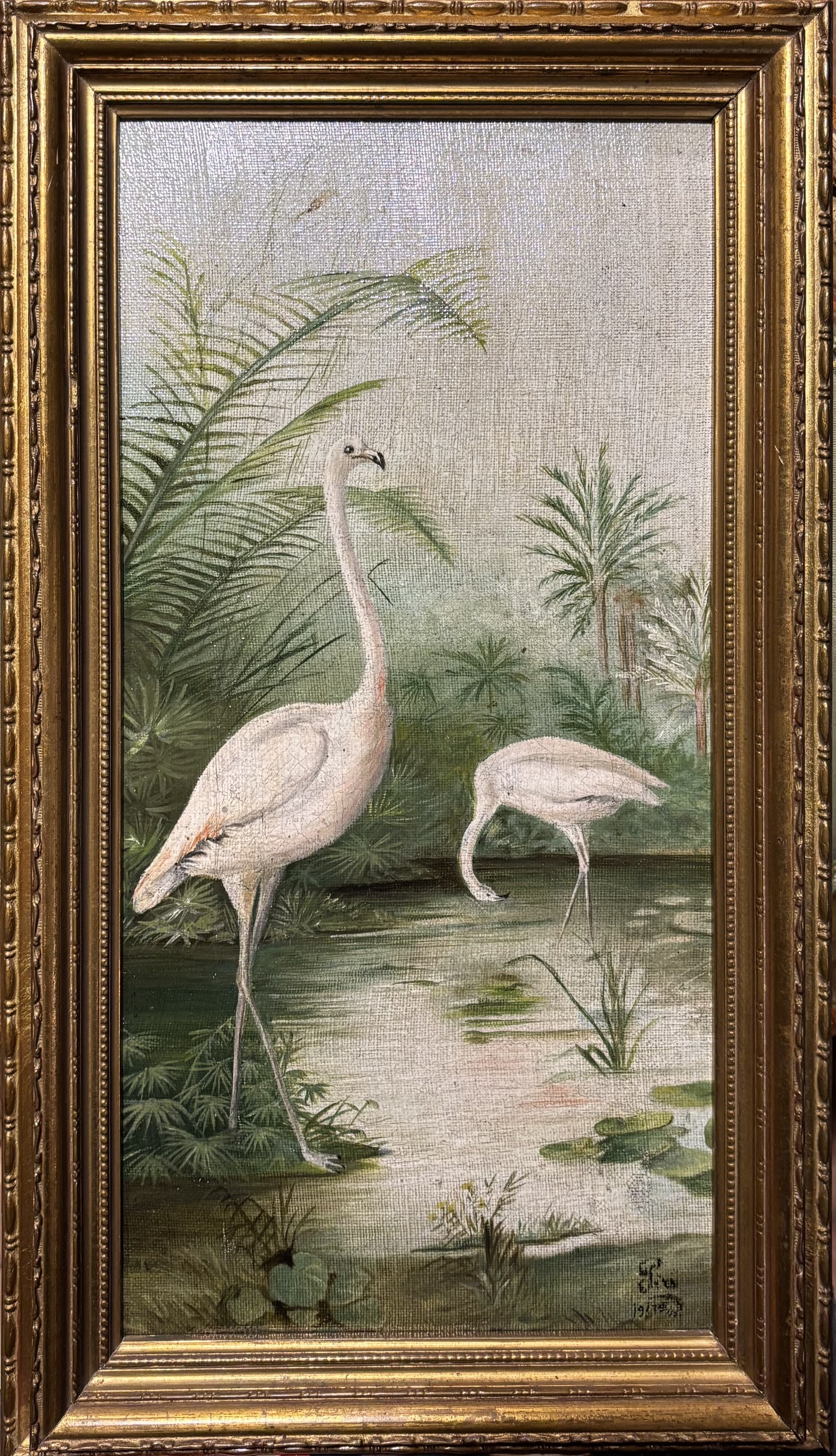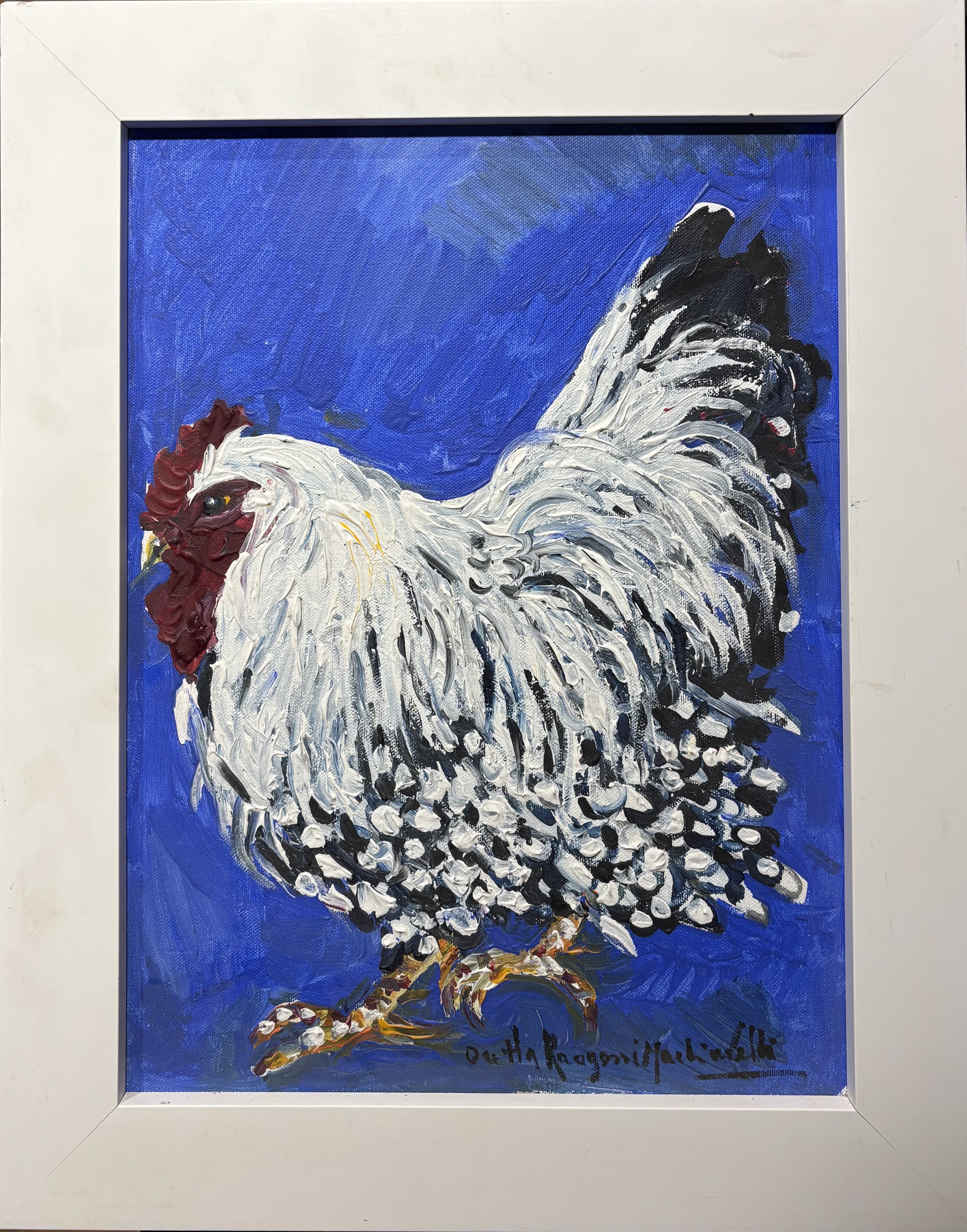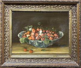 Una miniatura su avoriolina (cm 5 x 4,5), un dipinto su tavola raffigurante un cane (cm 17,5 x 23), un dipinto su tela nei modi di Sebastian Stoskopff raffigurante fragole entro piatto in ceramica (cm 27 x 35), un dipinto su tela di Orietta Rangoni Machiavelli raffigurante Gallina (cm 39 x 28) e un dipinto su tela firmato indistintamente in basso a destra raffigurante fenicotteri (cm 40 x 20).