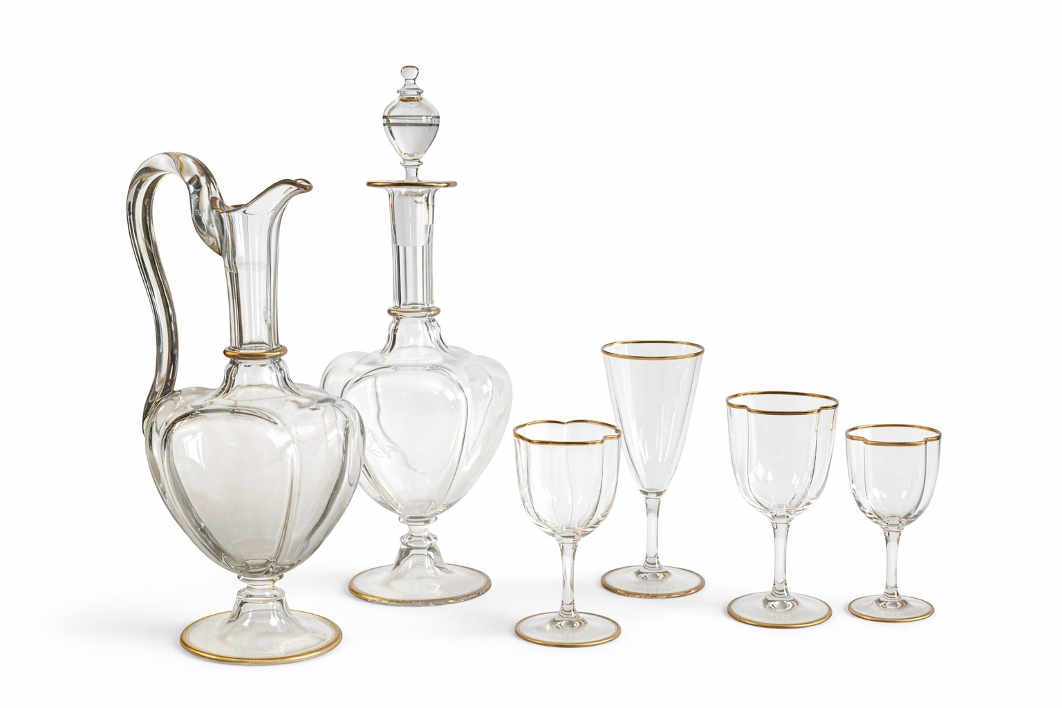 Il lotto comprende due caraffe (una con versatoio e una con tappo), quattro bicchieri da acqua, quattro da vino bianco, tre da vino rosso e due flute. Gli elementi presentano corpo in vetro trasparente con profili sagomati e bordi rifiniti da filetto dorato. Le caraffe, di forma mossa e decorativa, sono caratterizzate da corpo sfaccettato e piede svasato; una è dotata di ansa e beccuccio versatore, l’altra di tappo molato. Dimensioni :