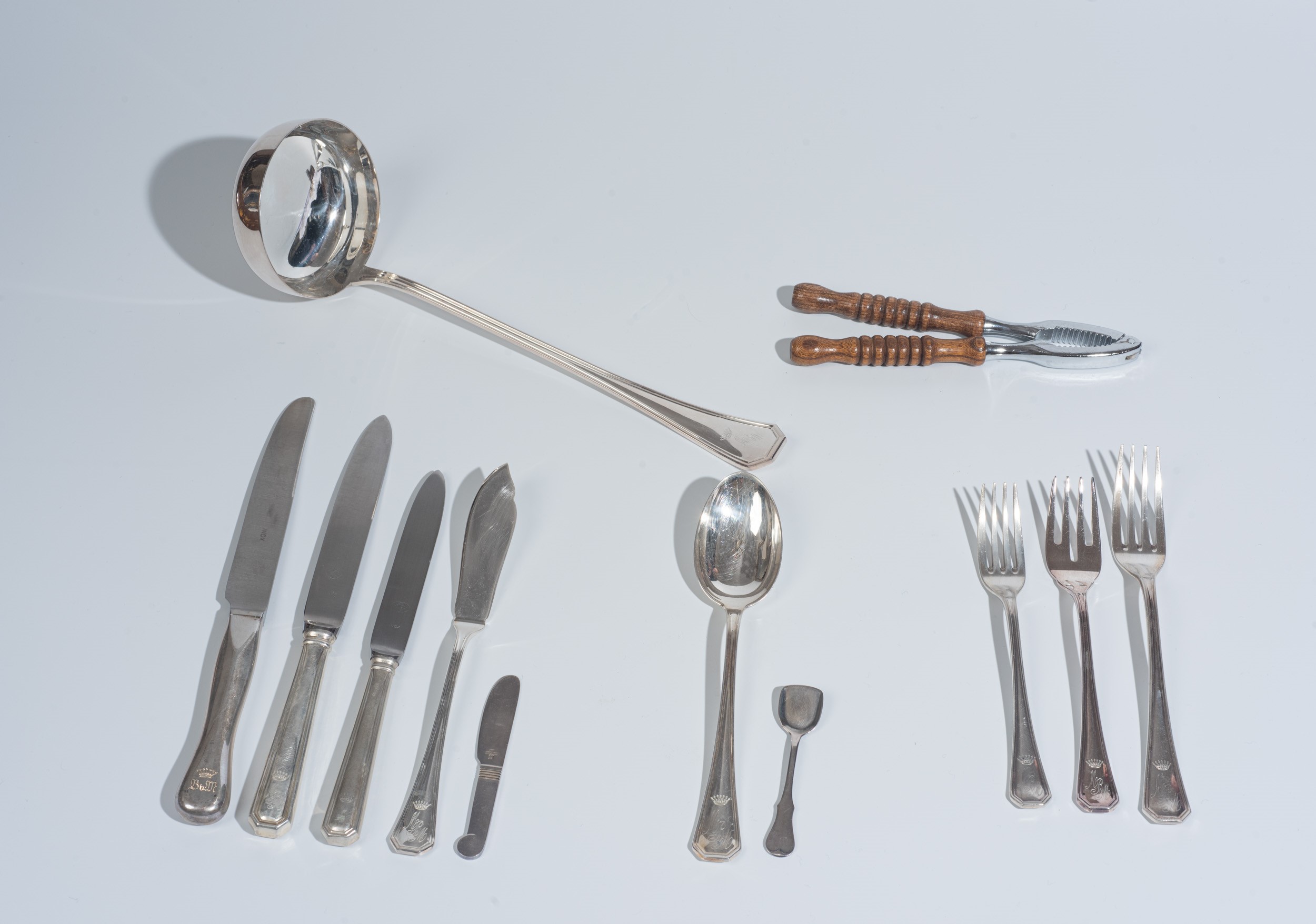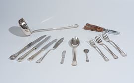 Composto da: 12 forchette, 7 cucchiai, 12 coltelli da pesce, 6 forchette, 6 forchette da frutta, 1 mestolo, 6 coltelli grandi, 6 coltelli piccoli.