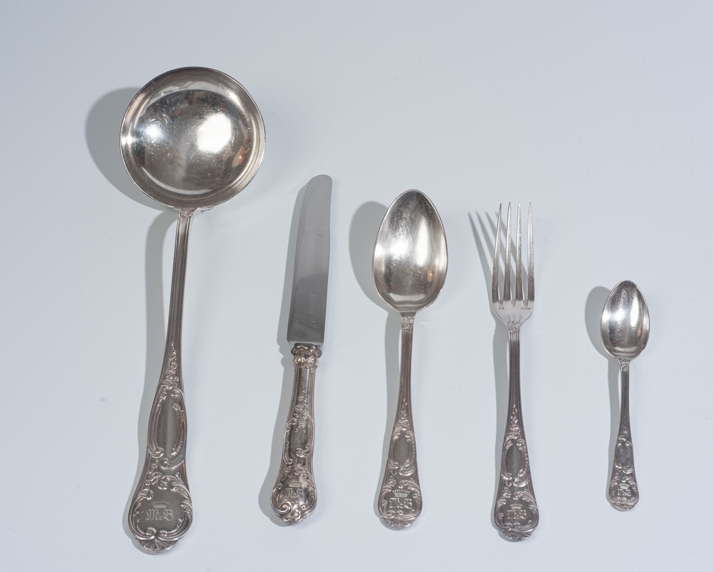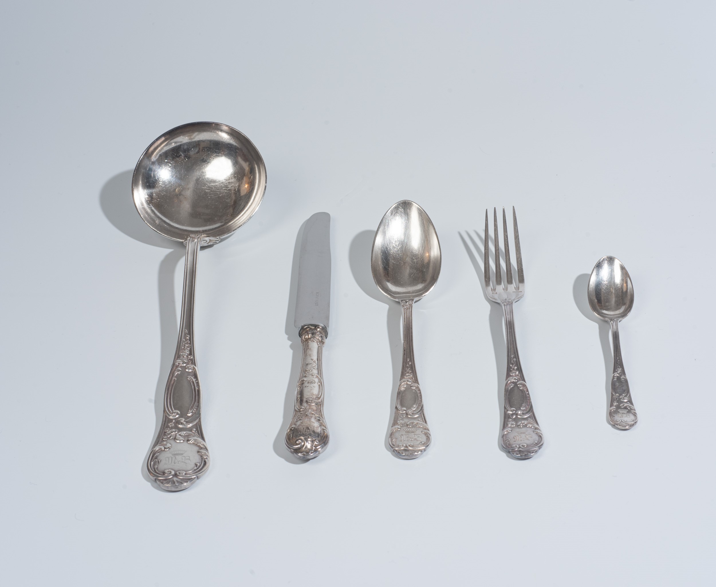 Composto da : 6 cucchiaini, 6 coltelli grandi, 6 cucchiai grandi, 6 forchette grandi e 1 mestolo. Peso totale : 1496 gr.