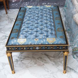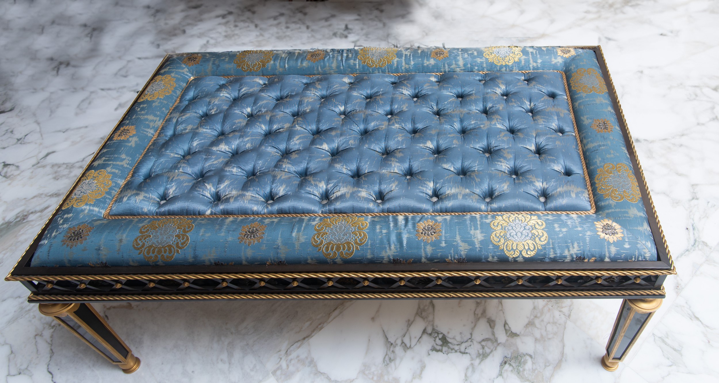 Tavolino da salotto in stile neoclassico. In metallo dorato e piano superiore in vetro inserito entro cornice imbottita rivestita in tessuto capitonné. Il piano è caratterizzato da una superficie centrale trasparente che lascia intravedere l’imbottitura sottostante lavorata a bottoni, mentre la fascia perimetrale presenta decorazioni geometriche e borchie metalliche su fondo scuro, con profilo rifinito da cordonatura dorata. La struttura è sostenuta da quattro gambe dritte rastremate con elementi metallici dorati e inserti decorativi verticali, poggianti su piccoli piedini.