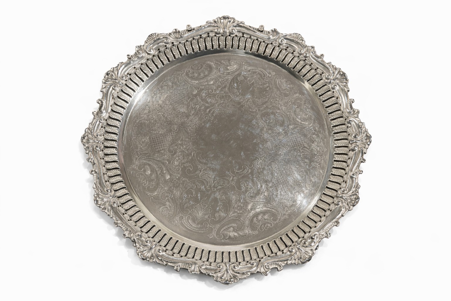 di forma circolare in metallo argentato, decorazioni incise e bordatura centinata e traforata