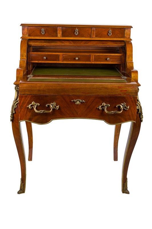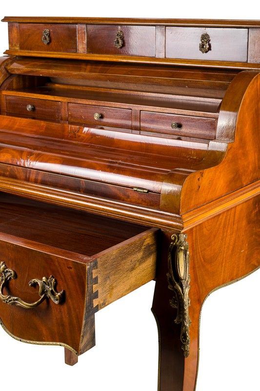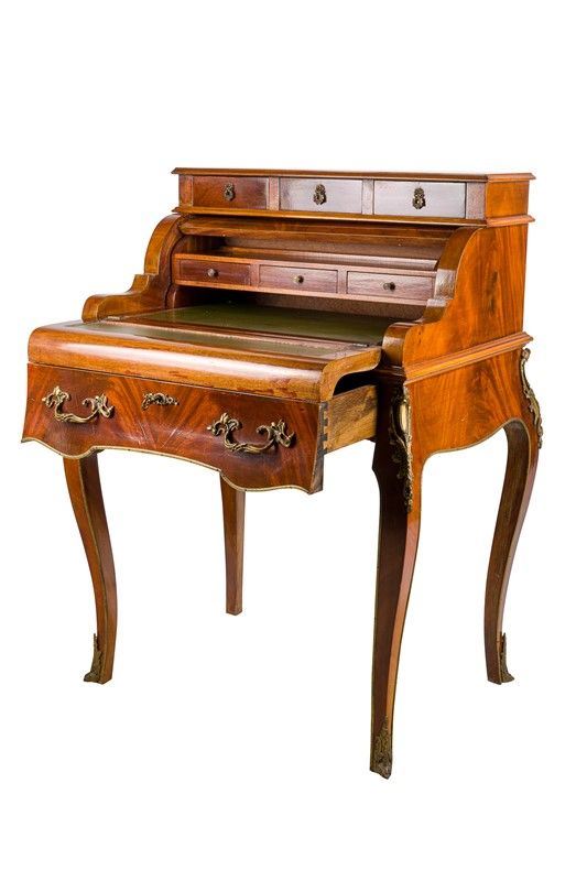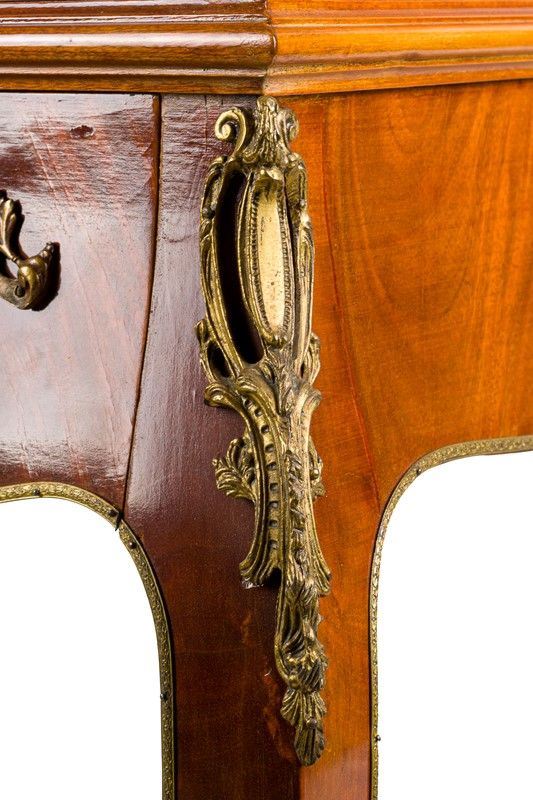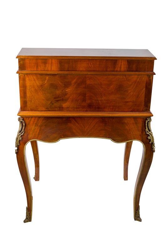 upper band with three drawers, central body with openable top lined in green leather, compartment and three drawers plus an additional drawer below; bronze applications, small defects