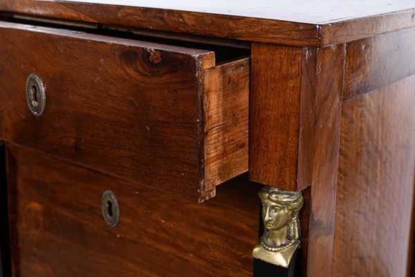 in walnut wood, front with three drawers, herms in ebonized wood and bronze on the sides, bronze keyhole.