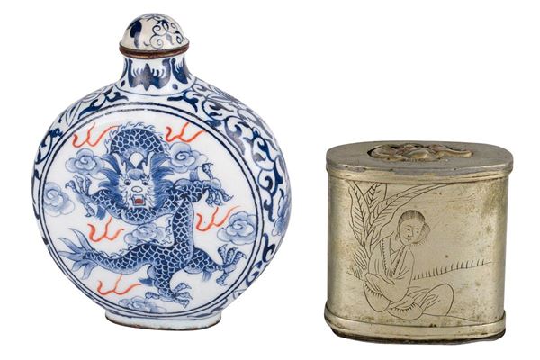 consisting of: pewter opium water pipe, engraved brand; snuff bottle with enamel dragons decoration, brand on the bottom; pewter ring holder with erotic decoration