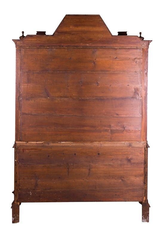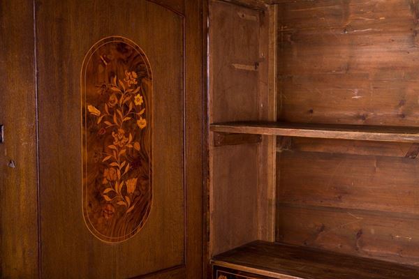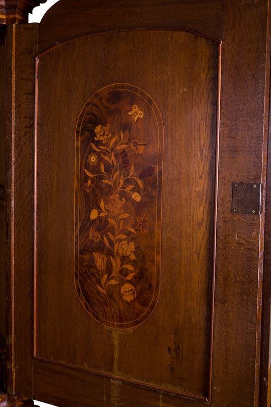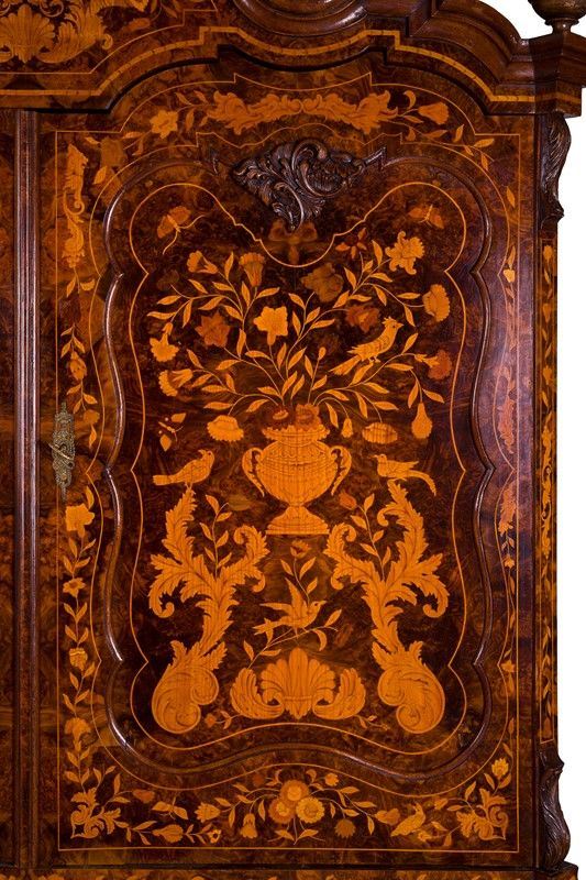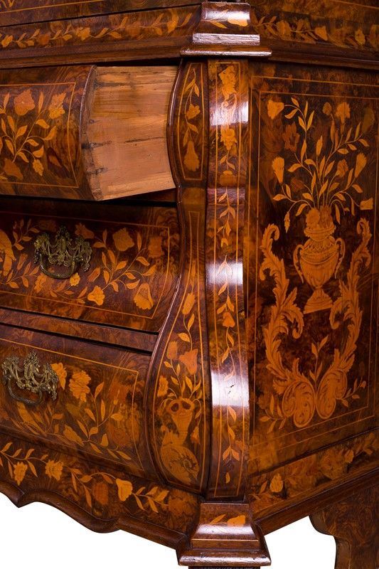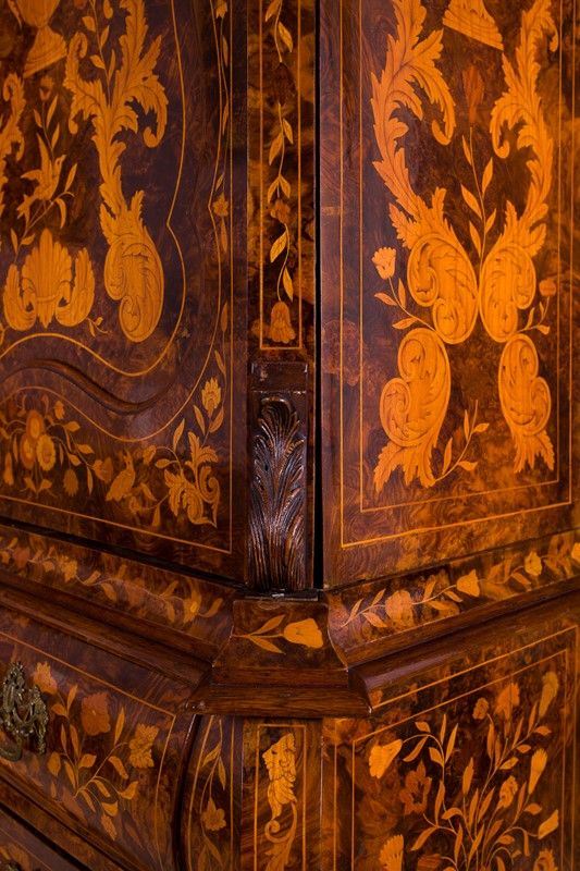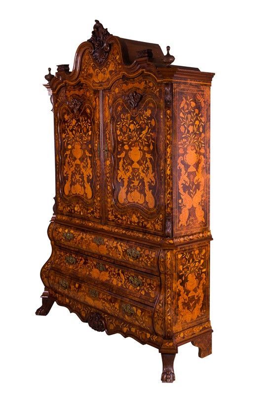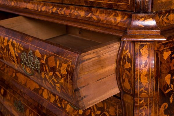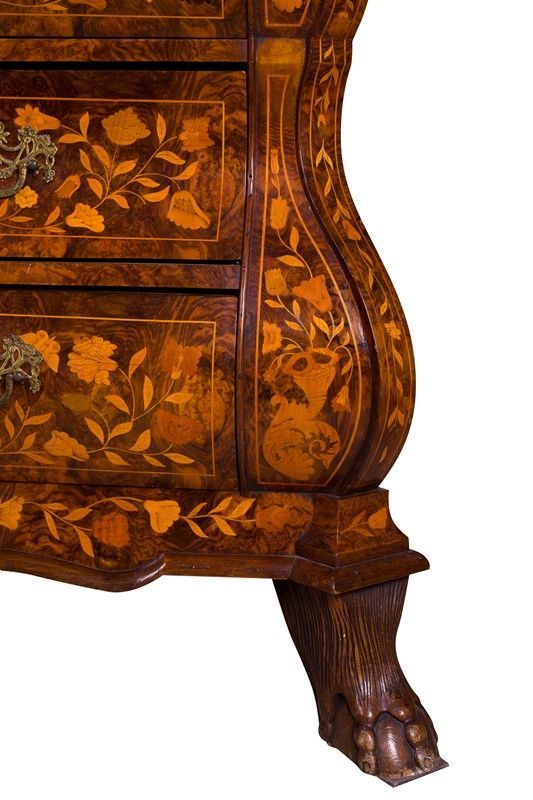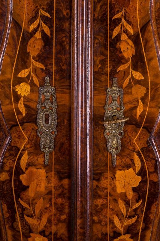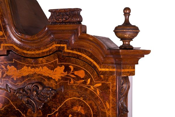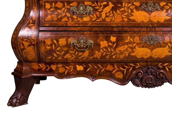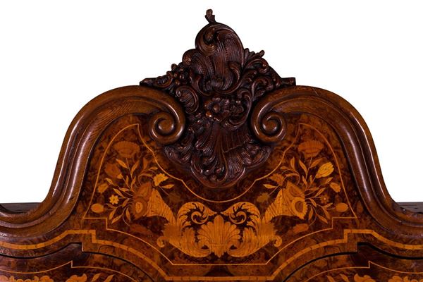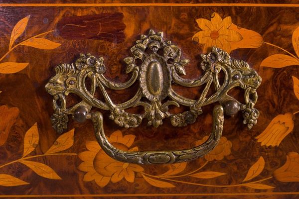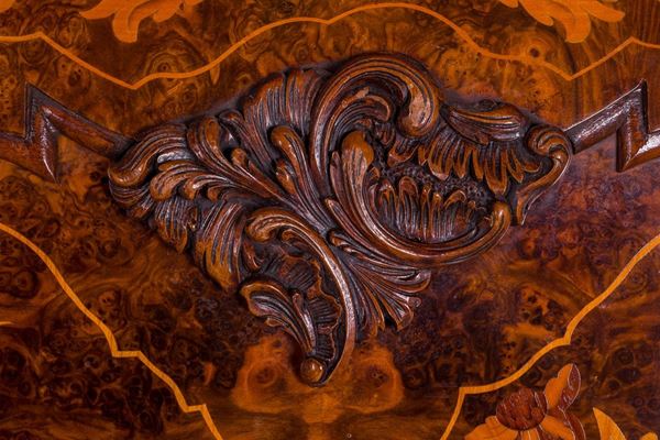 veneered in walnut briar and inlaid with floral and animal motifs on three sides, upper body with two shaped doors, rounded lower body marked by three drawers embellished with finely chiseled bronze handles. Important moved coping, uprights and notches, legs with claw and ball endings. The two upper doors conceal two large open compartments and two small drawers.