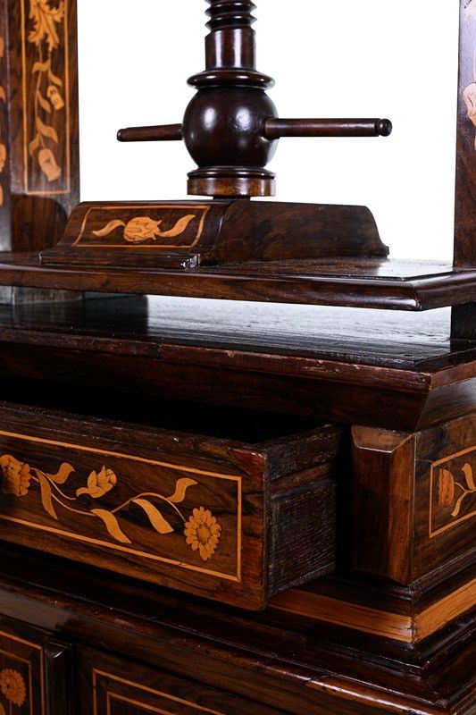richly inlaid with flowers and birds of various essences, with two doors and one drawer, onion feet.