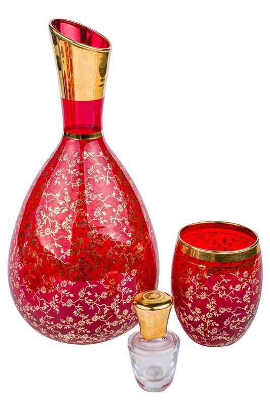 Liquor service with six small glasses and bottle with stopper, Venetian manufacture, 20th century