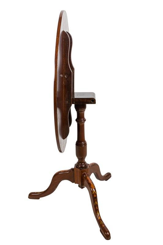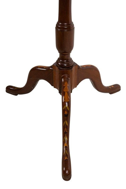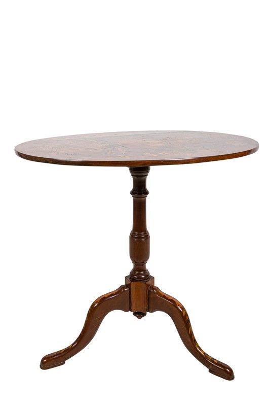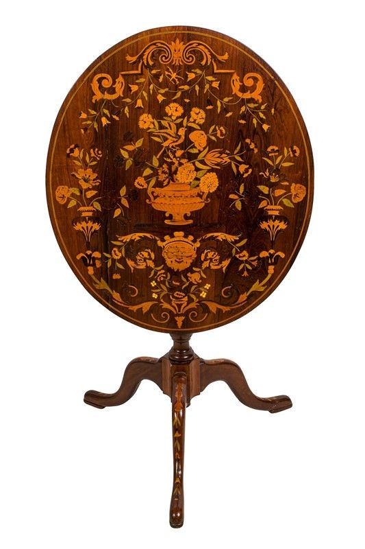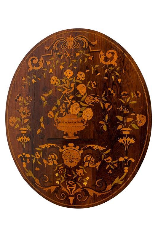 with inlays in various woods, resting on three feet, with a top richly decorated with scrolls, floral motifs and a mask.
