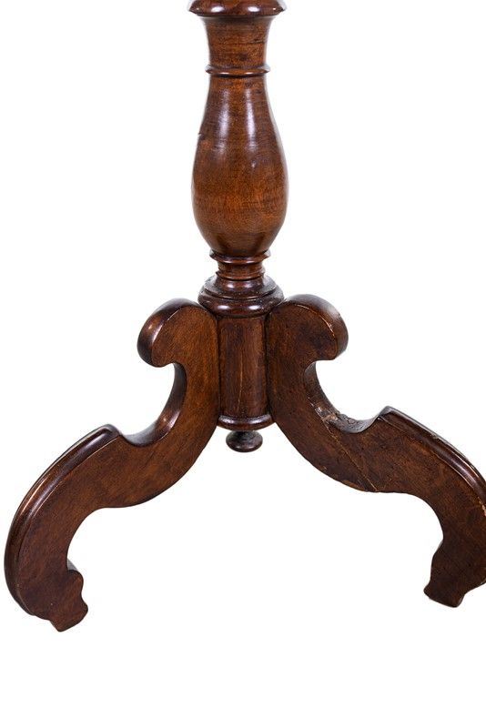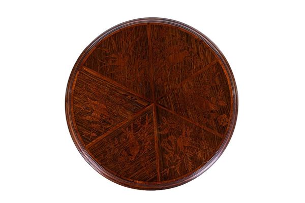 with inlays in various essences depicting flowers and birds, central turned leg ending in three shaped feet.