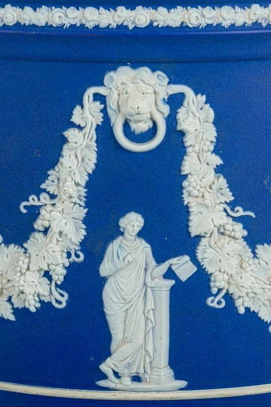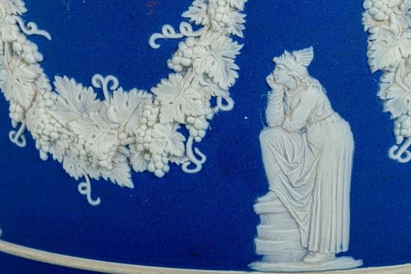 in cobalt blue Jasper ceramic decorated with garlands and six neoclassical figures in relief, marked, slight defect under the base