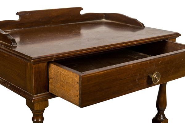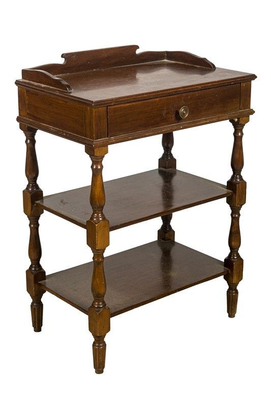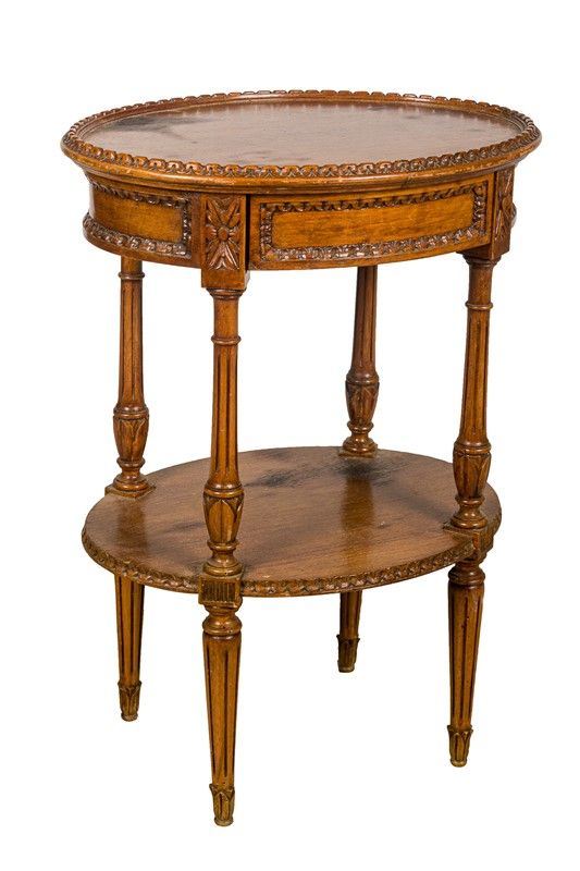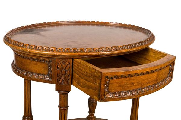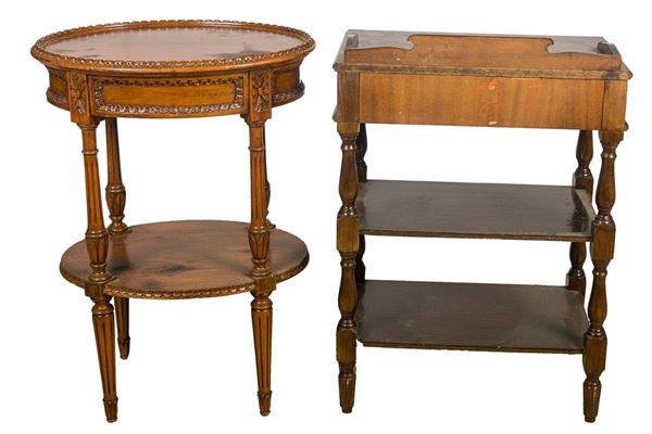 bedside table in walnut-stained wood (Italian manufacture, second half of the 20th century) with two shelves and a drawer resting on turned legs; round oak coffee table (French manufacture, early 20th century) with two shelves and one drawer, fluted legs