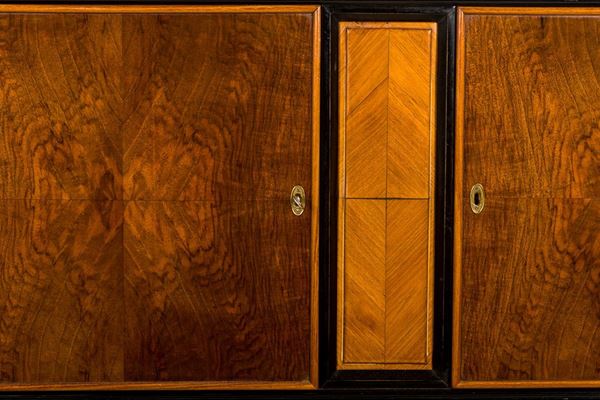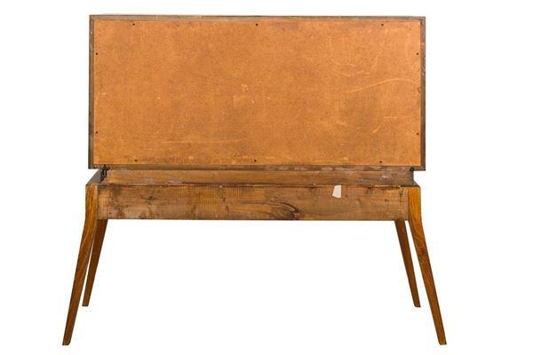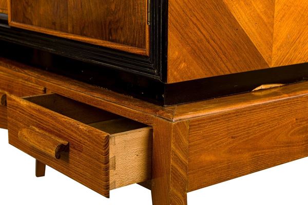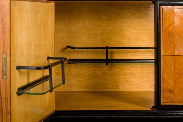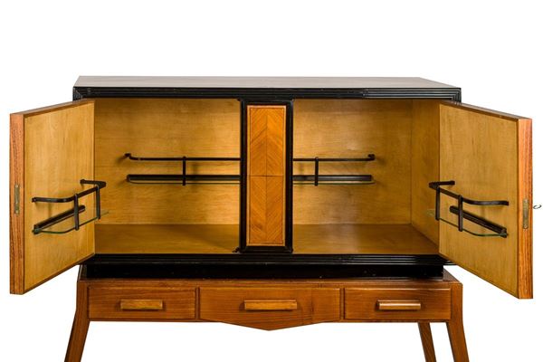 composed of two pieces: base with three drawers and interior in maple, upper part with two doors and glass shelves