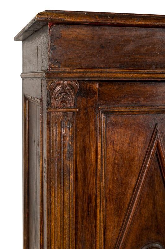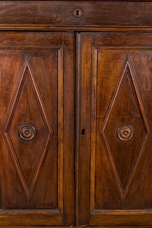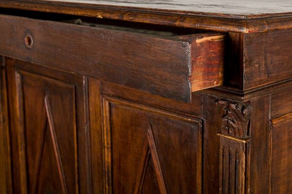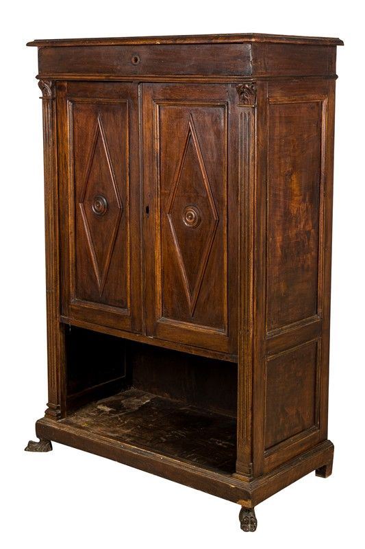 walnut veneer, two doors carved with lozenge motifs and a drawer, feral feet, defects and shortcomings
