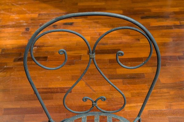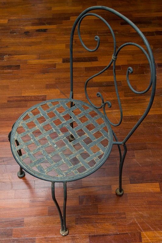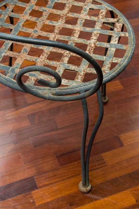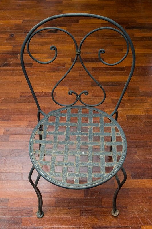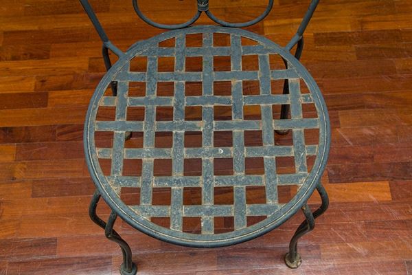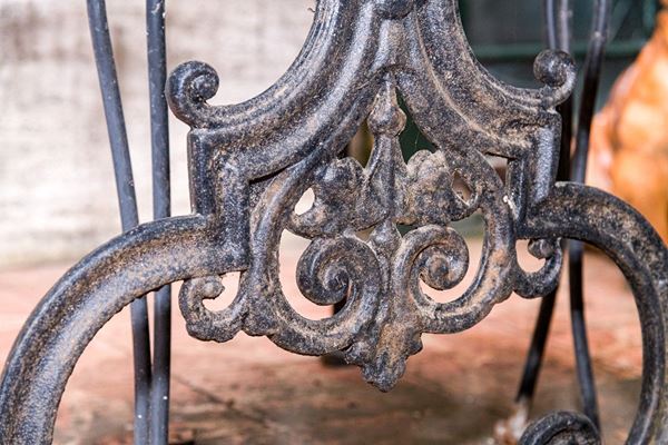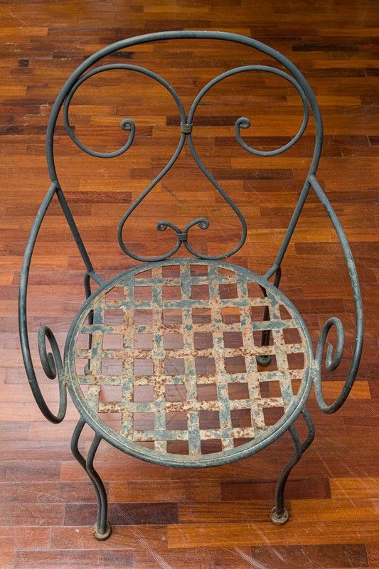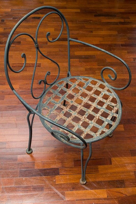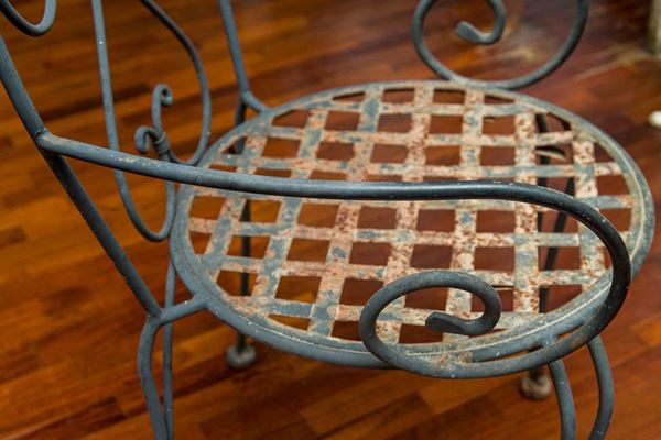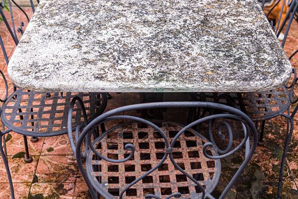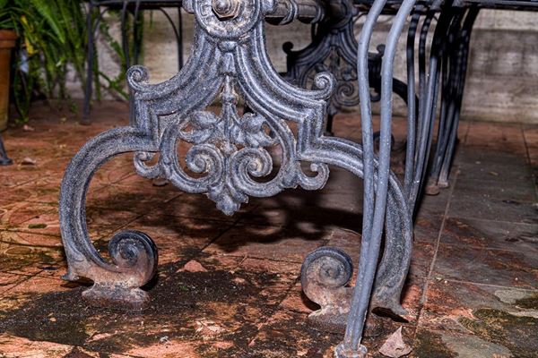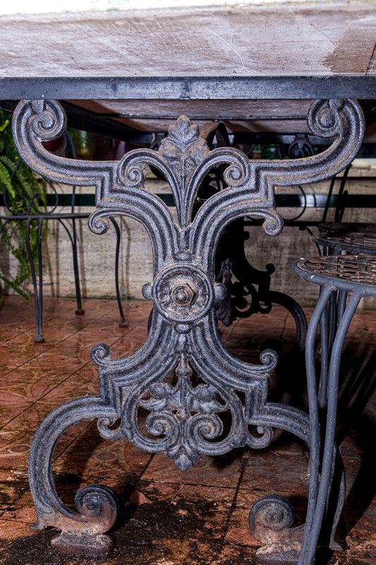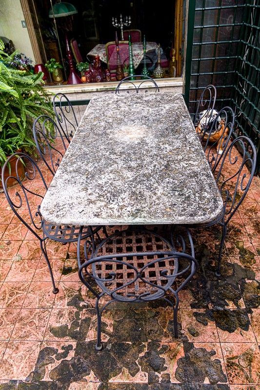 with travertine top, cast iron base, complete with 6 chairs and 2 iron armchairs (not pertinent). The objects are visible only in photos and must be collected directly from the owner's house (Rome)