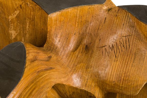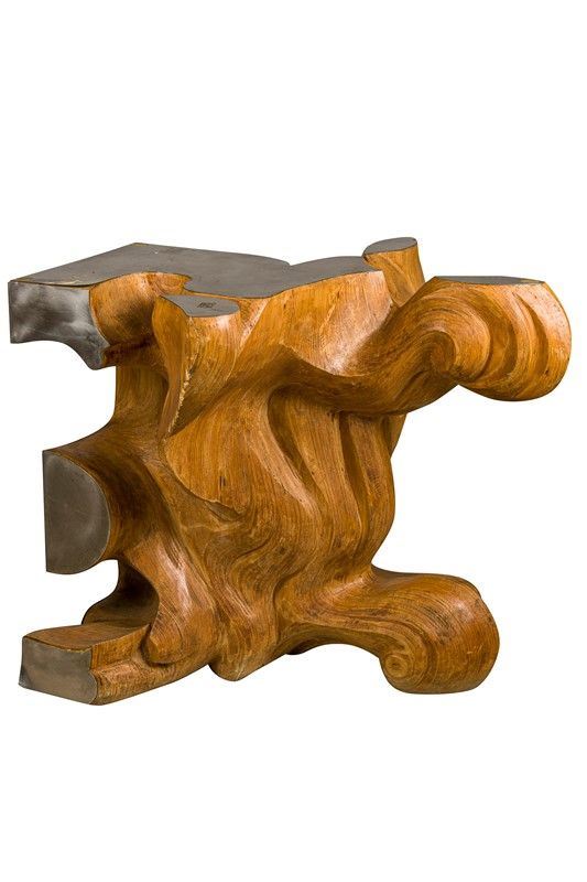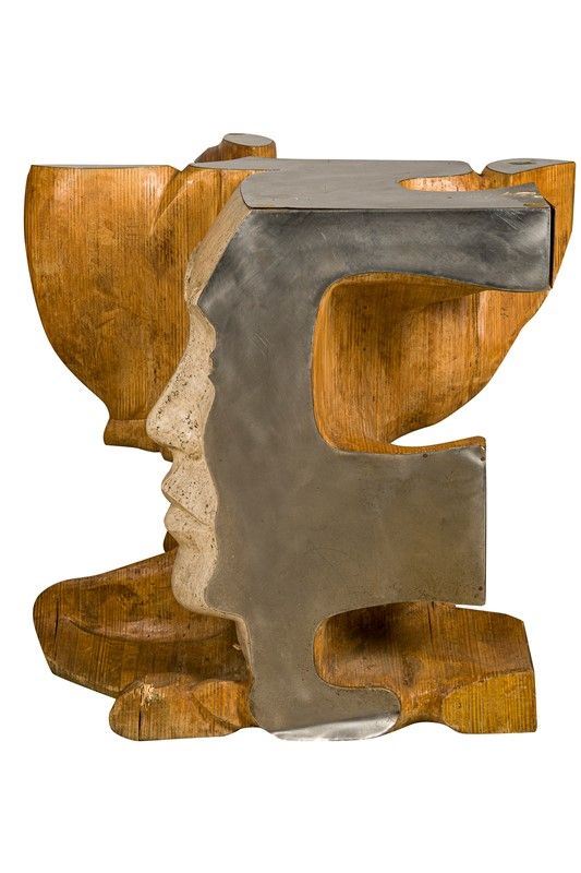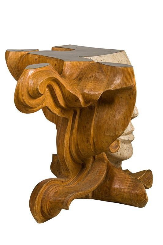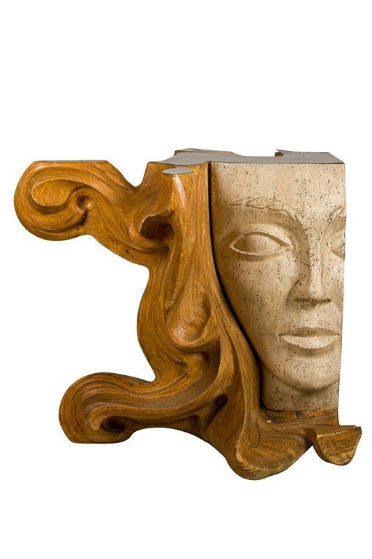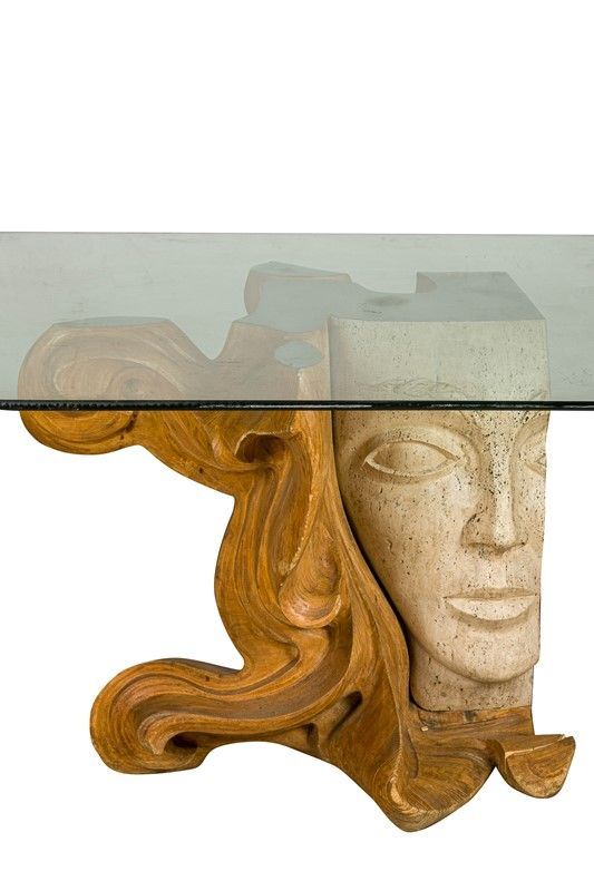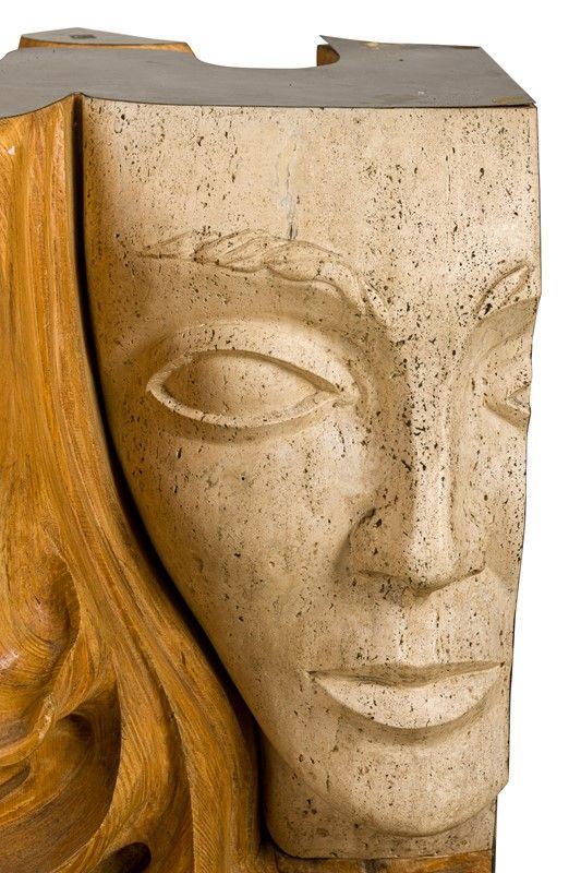 with base in travertine, wood and steel depicting face and top in crystal, breaks and defects