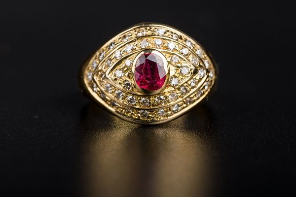 with brilliant cut diamonds set in pave for about 0.60 carats, oval heat-treated ruby in the center, gross weight: 6.1 gr.