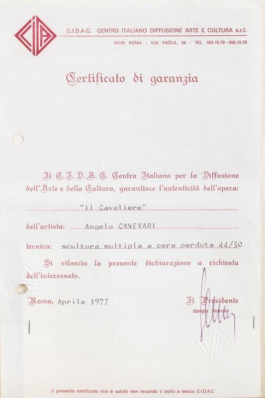 lost wax bronze, multiple 44/50, signed. The work is accompanied by a certificate of guarantee from the Italian Center for the Diffusion of Art and Culture