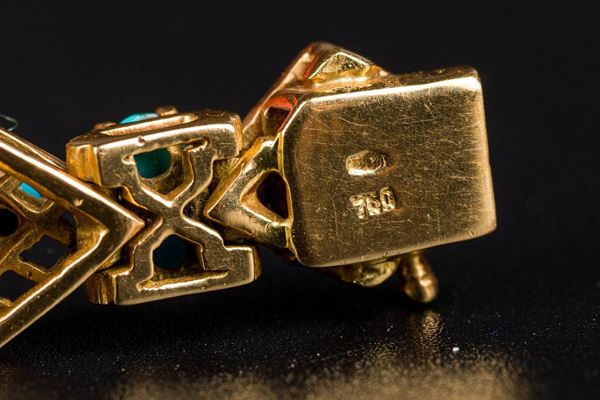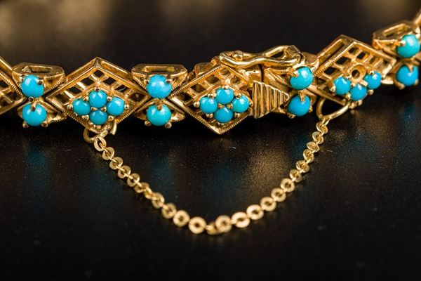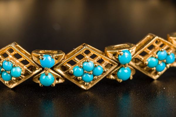 semi-rigid, with rhomboid motifs, small spools of turquoise all-over the band of the bracelet, integrated closure, gross weight: 29.2 gr.