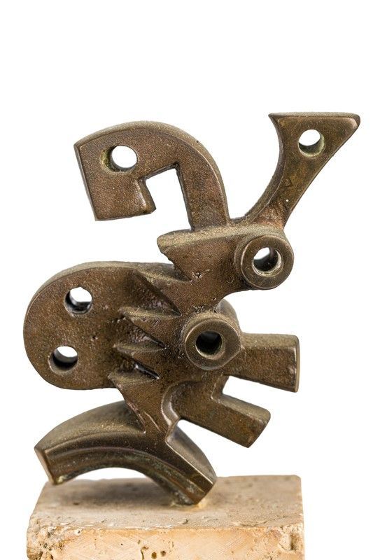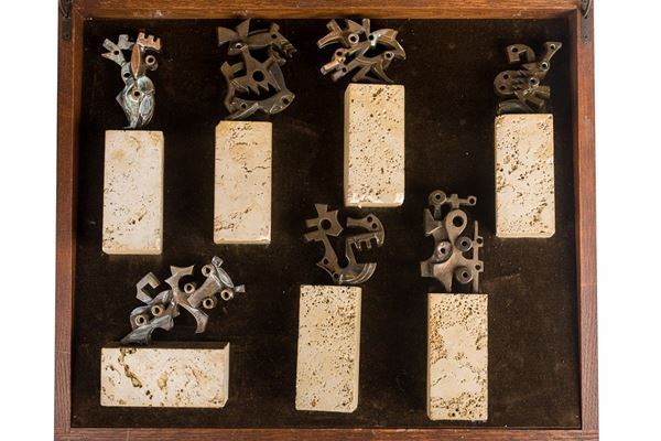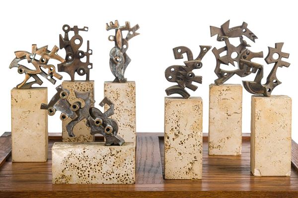 series of 6 small bronzes on travertine base, multiple, 7/100, signed, in wooden case