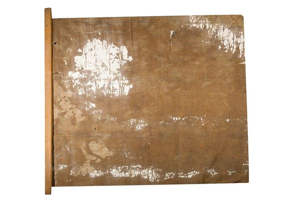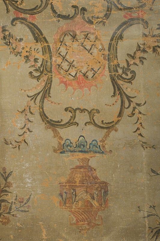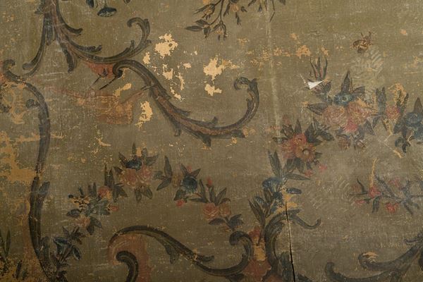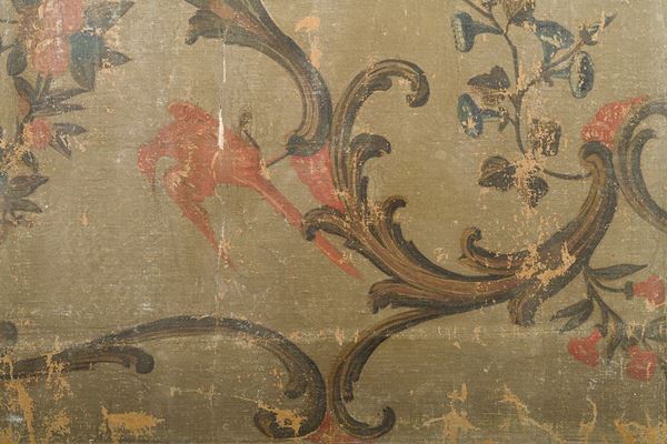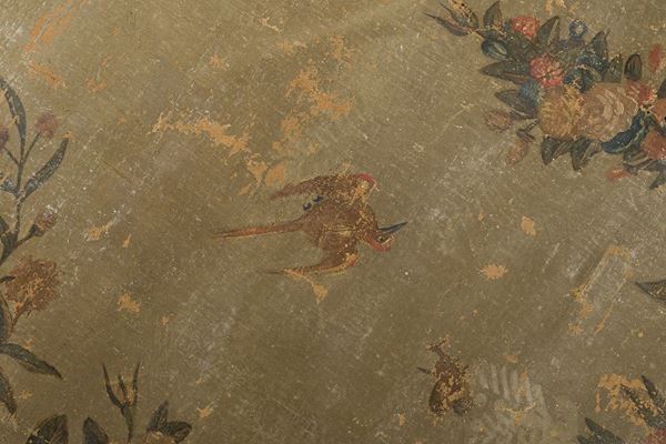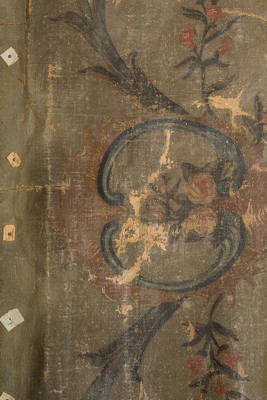 the canvas, decorated with floral and zoomorphic motifs, has breakages, spots and drops of color